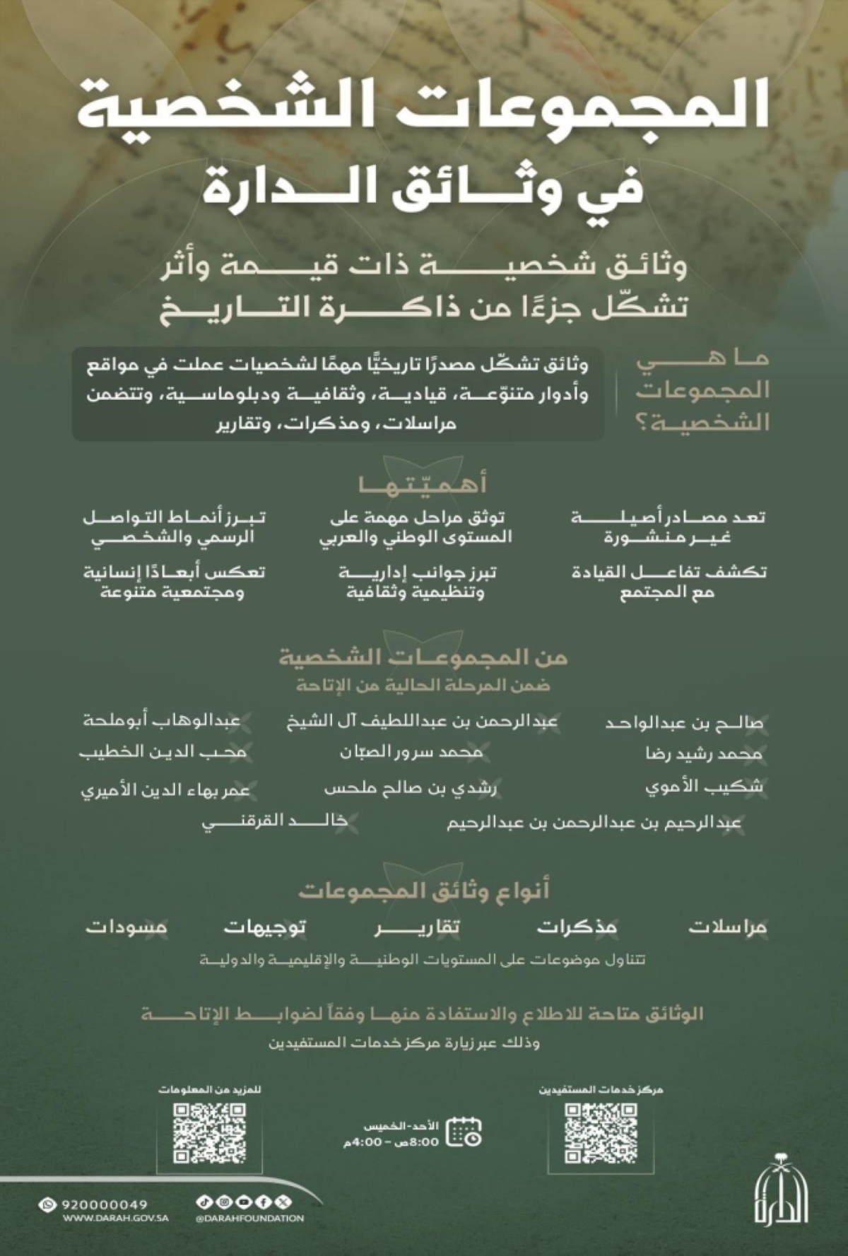 أتيحت 11 مجموعة وثائقية شخصية تُنشر للمرة الأولى، تمثل كنوزا تاريخية متنوعة في مضامينها وتوثّق أزمنة متعددة من تاريخ المملكة، وذلك ضمن المرحلة الحالية من الإتاحة في إطار مشروع وطني لخدمة الذاكرة التاريخية.