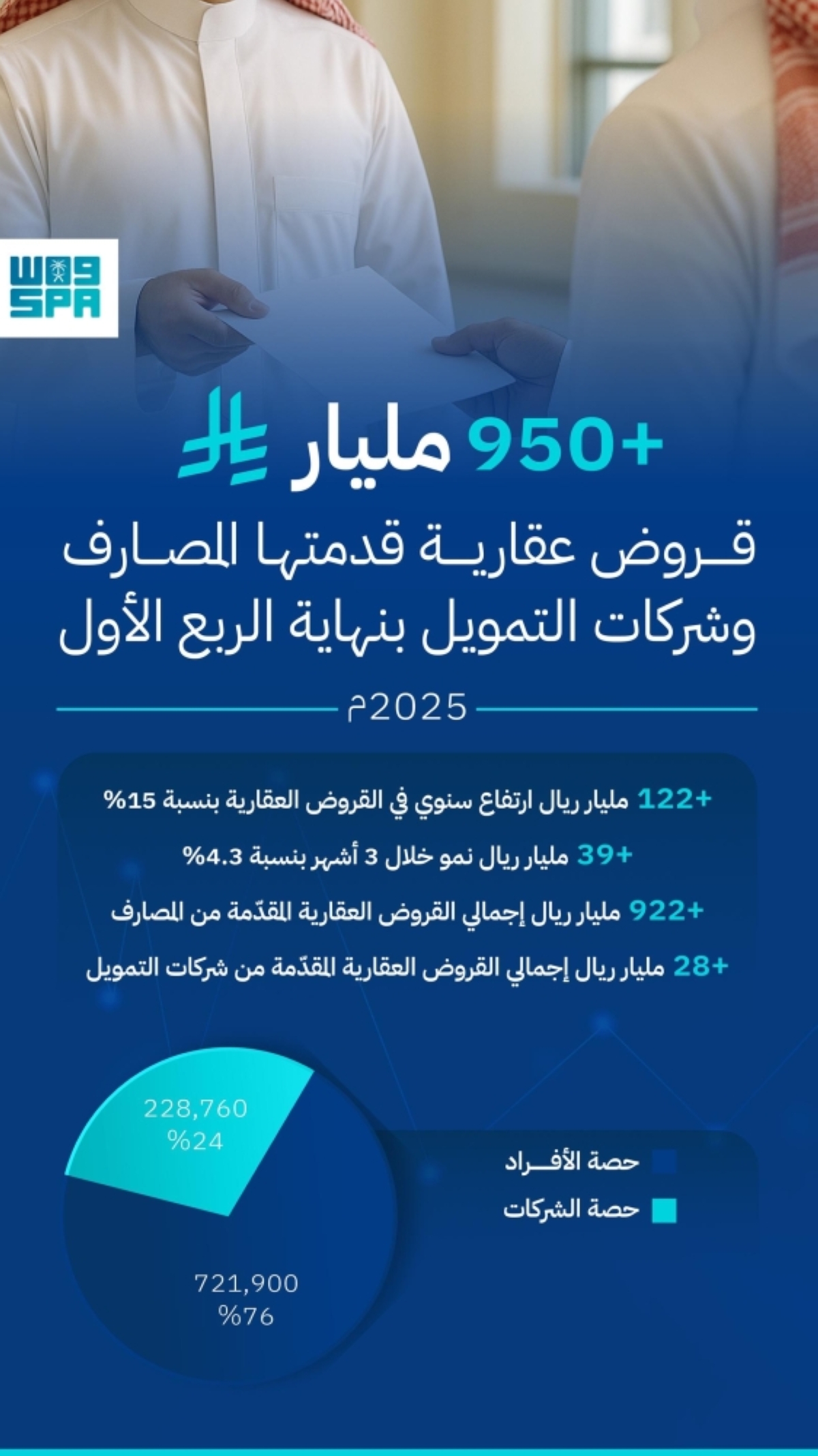 يشار إلى أن المصارف التجارية استحوذت على الحصة الأكبر من إجمالي التمويل العقاري بنسبة 97%، بقيمة بلغت 922.2 مليار ريال، فيما قدمت شركات التمويل ما نسبته 3% من الإجمالي، بقيمة بلغت 28.46 مليار ريال.