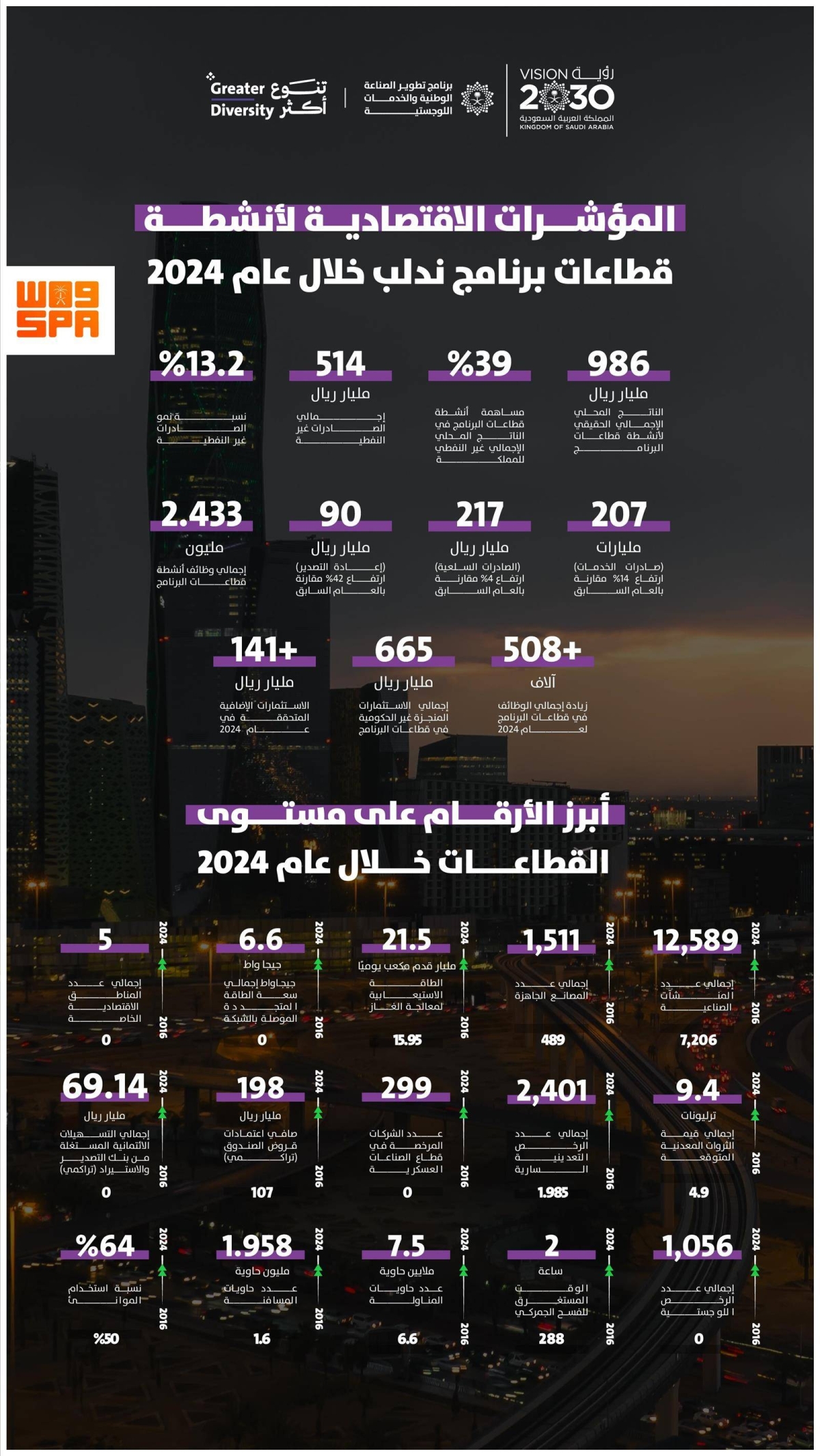 وكشف تقرير «ندلب» السنوي العديد من الإحصائيات، إذ بلغت مساهمة أنشطة البرنامج في الناتج المحلي غير النفطي نسبة 39%، وهو ما يعادل 986 مليار ريال، مرتفعة من 949 مليار ريال في 2023، فيما بلغت مساهمة الأنشطة غير النفطية في الناتج المحلي الإجمالي للمملكة 55%، في الوقت الذي حقق فيه قطاع الصناعات التحويلية نموا بنسبة 4%، بينما سجل قطاعا التعدين والنقل والتخزين نموا بنسبة 5% خلال العام.