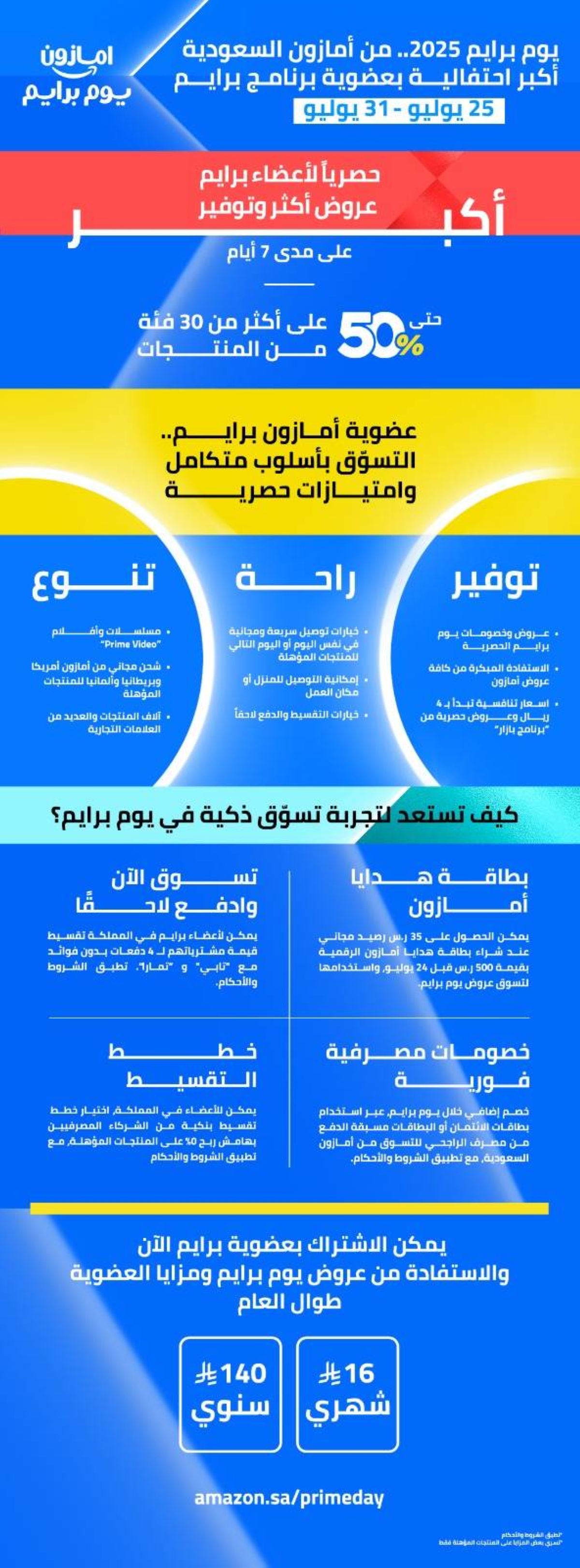 أمازون السعودية تُطلق 7 أيام متواصلة من عروض "يوم برايم 2025" الحصرية لأعضاء برايم، من 25 - 31 يوليو