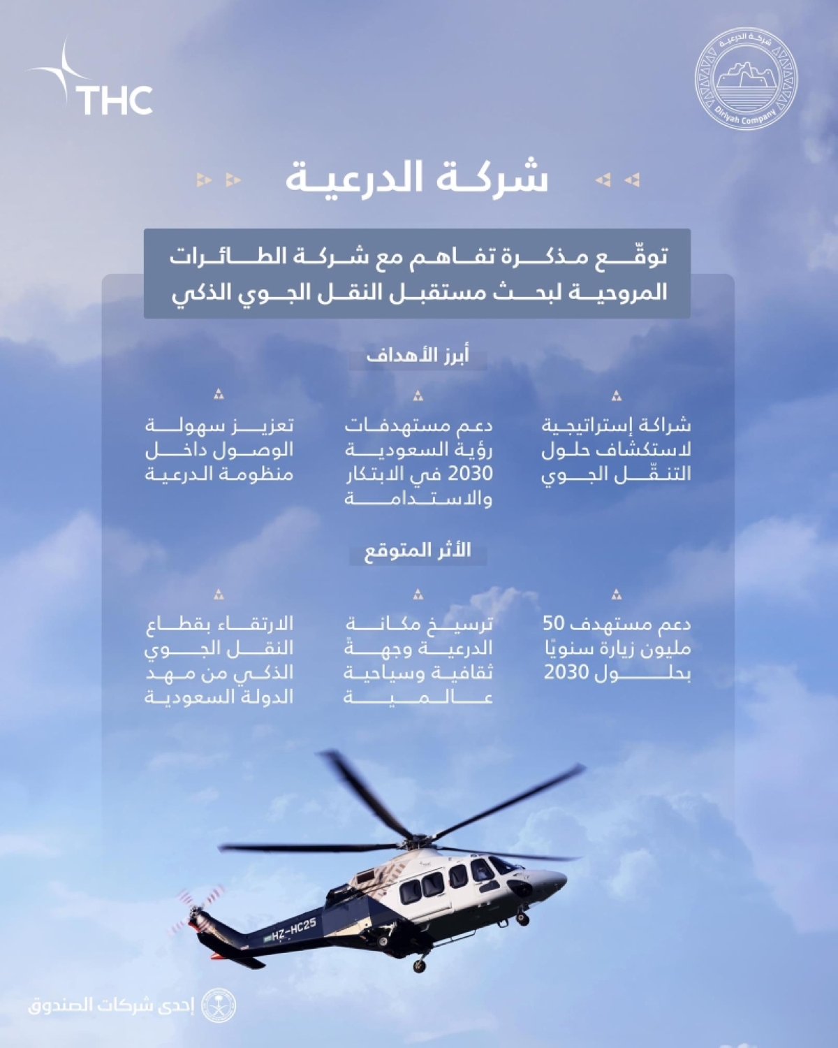 أعلنت شركة الدرعية عن توقيع مذكرة تفاهم مع شركة الطائرات المروحية، أكبر مشغل تجاري لخدمات الطيران المروحي في المملكة، بهدف بحث فرص تطوير حلول نقل جوي مبتكرة ضمن مشروع الدرعية، الذي يستعد لأن يكون أكبر وجهة ثقافية وسياحية في العالم، ويستهدف استقبال 50 مليون زيارة سنويا بحلول 2030.
