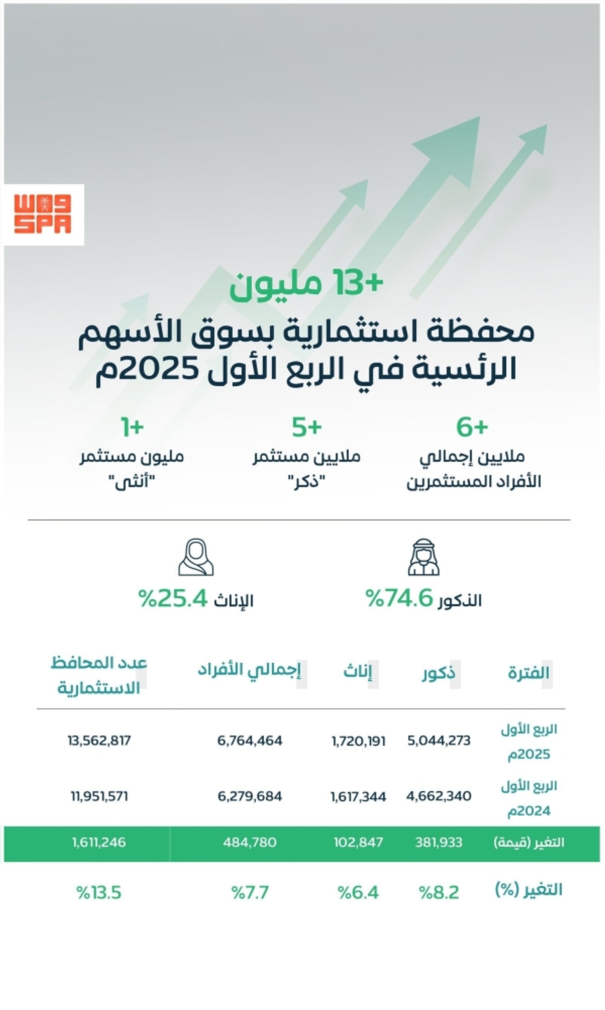 وشهدت أعداد الإناث نموا ربعيا بنسبة 2.2%، بزيادة بلغت 37,165 مستثمرة، مقارنة بـ 1,683,026 مستثمرة خلال الربع الرابع 2024م.