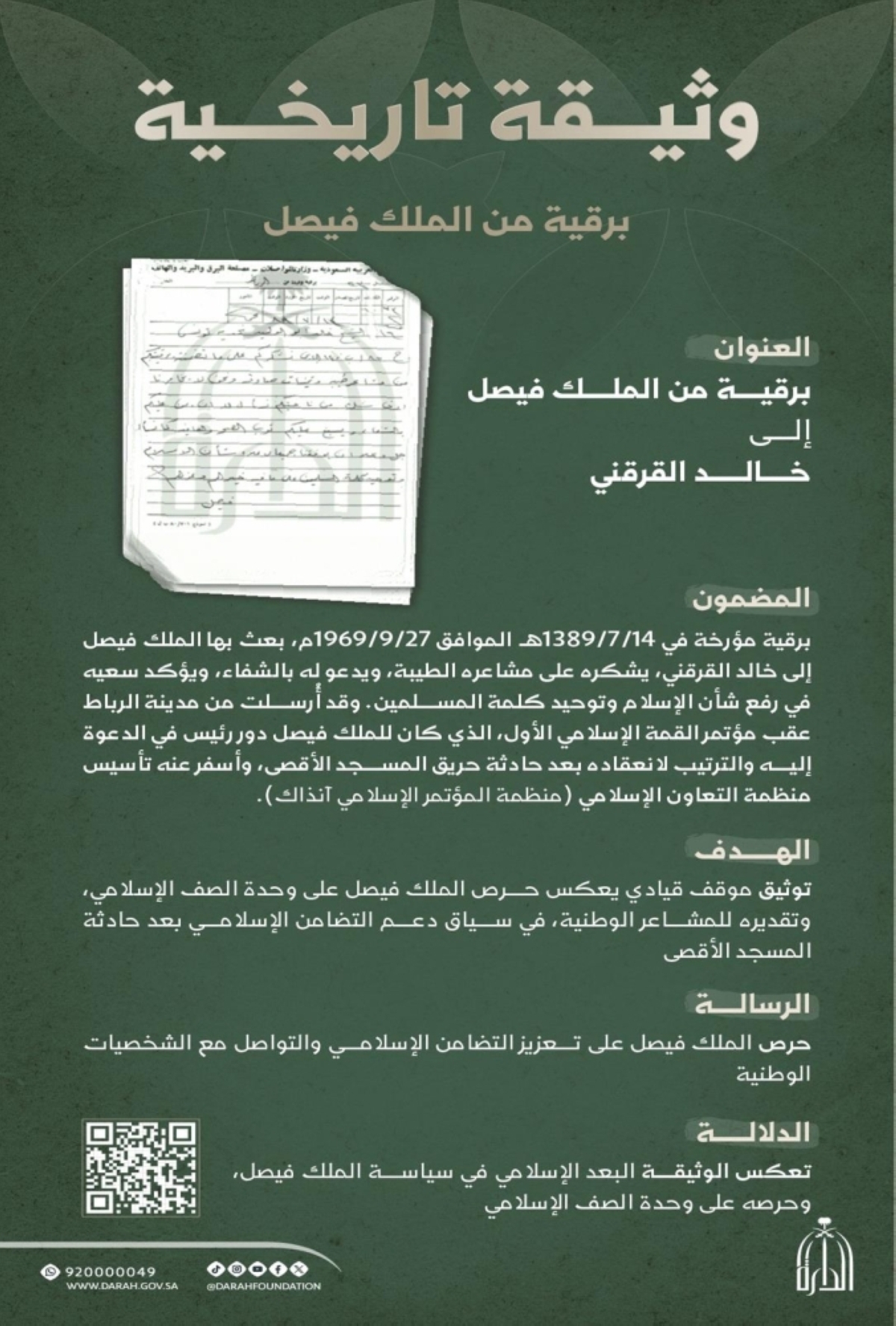 وبينت الدارة أن الوثيقة تعكس البعد الإسلامي في سياسة الملك فيصل - رحمه الله -، وحرصه على وحدة الصف، ودعم التضامن الإسلامي، وتقديره للمشاعر الوطنية، والتواصل مع الشخصيات المؤثرة بعد حادثة المسجد الأقصى.