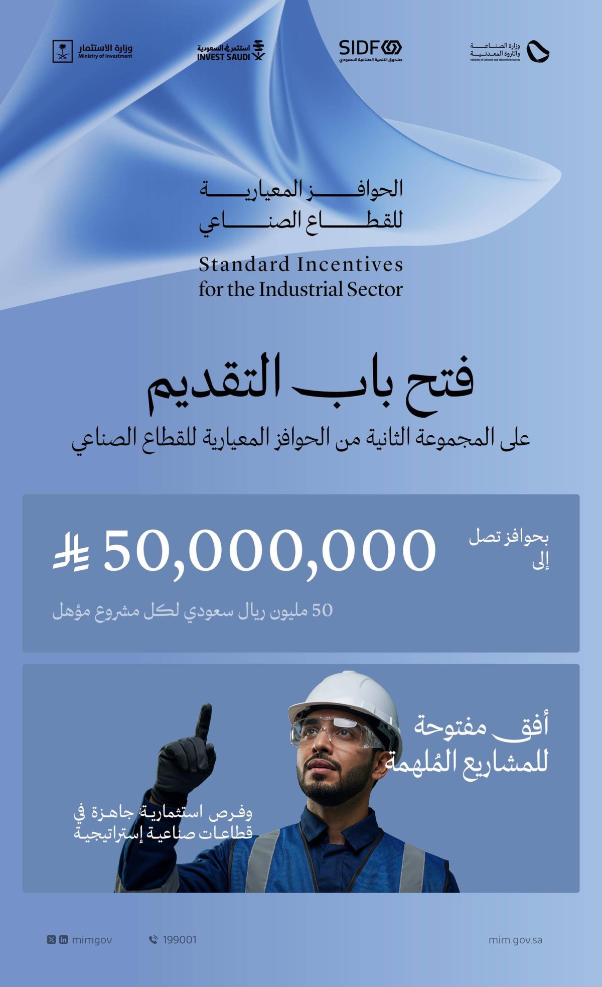 أعلنت وزارتا الصناعة والثروة المعدنية والاستثمار عن بدء استقبال طلبات التقديم على المجموعة الثانية من الحوافز المعيارية للقطاع الصناعي بالمملكة، التي تتضمن تغطية تصل إلى 35% من قيمة الاستثمار الأولي للمشروع، وبحد أقصى 50 مليون ريال لكل مشروع مؤهل، موزعة بالتساوي بين مرحلتي الإنشاء والإنتاج، بما يوفر تمكينا مستداما للأداء المالي والتشغيلي لمدة تصل إلى 7 سنوات، وذلك في إطار الجهود المستمرة لتعزيز البيئة الاستثمارية، وزيادة جاذبية المملكة بصفتها وجهة صناعية رائدة على المستويين الإقليمي والدولي، وتمكين إنتاج سلع غير مصنعة حاليا داخل المملكة.