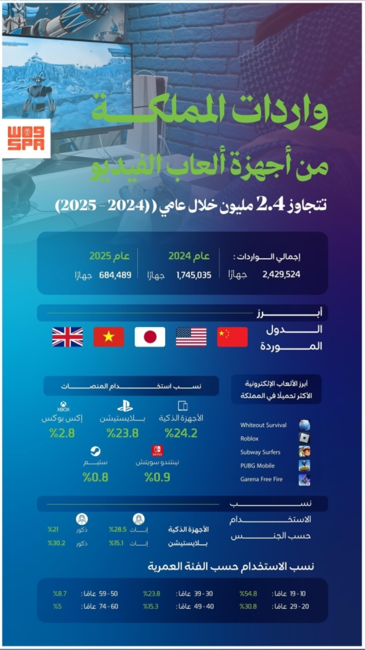 سجل قطاع الألعاب الالكترونية في المملكة نموا ملحوظا خلال العامين الماضيين، حيث بلغ حجم واردات أجهزة ألعاب الفيديو خلال عامي 2024م و2025م ، ما مجموعه 2،429،524 جهازا، وفقا لبيانات صادرة عن هيئة الزكاة والضريبة والجمارك زاتكا.
