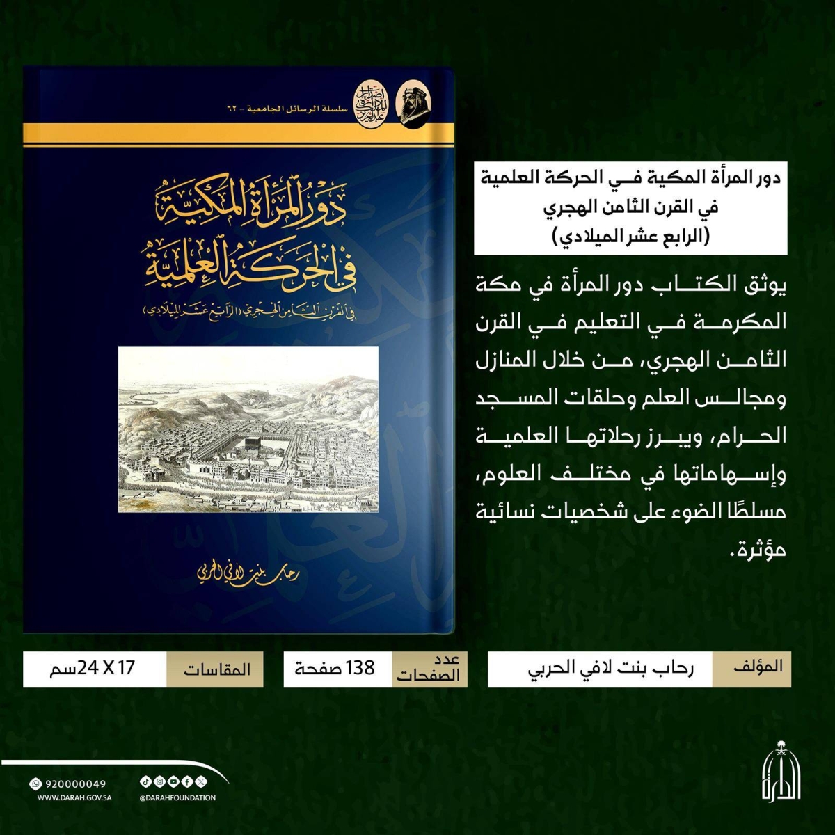 أصدرت دارة الملك عبدالعزيز مؤخرا إصدارا علميا بعنوان «دور المرأة المكية في الحركة العلمية في القرن الثامن الهجري (الرابع عشر الميلادي)»، يسلط الضوء على الإسهامات العلمية للمرأة في مكة المكرمة خلال إحدى الحقب البارزة في تاريخها العلمي.