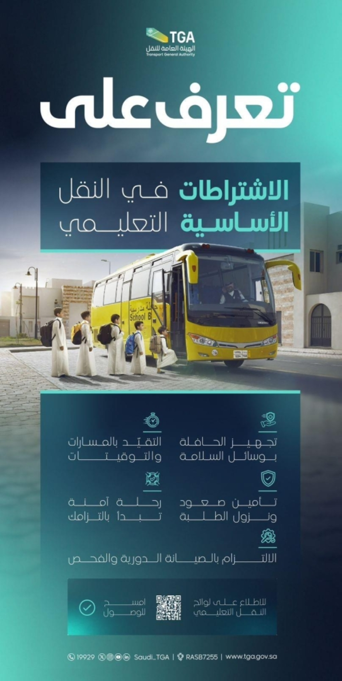 أكدت الهيئة العامة للنقل أهمية الالتزام بالاشتراطات الأساسية في وسائل النقل المخصصة لنقل الطلاب، تزامنا مع بداية العام الدراسي الجديد 1447هـ، مشيرة إلى أن تطبيق هذه المتطلبات يعزز سلامة تنقل الطلاب.