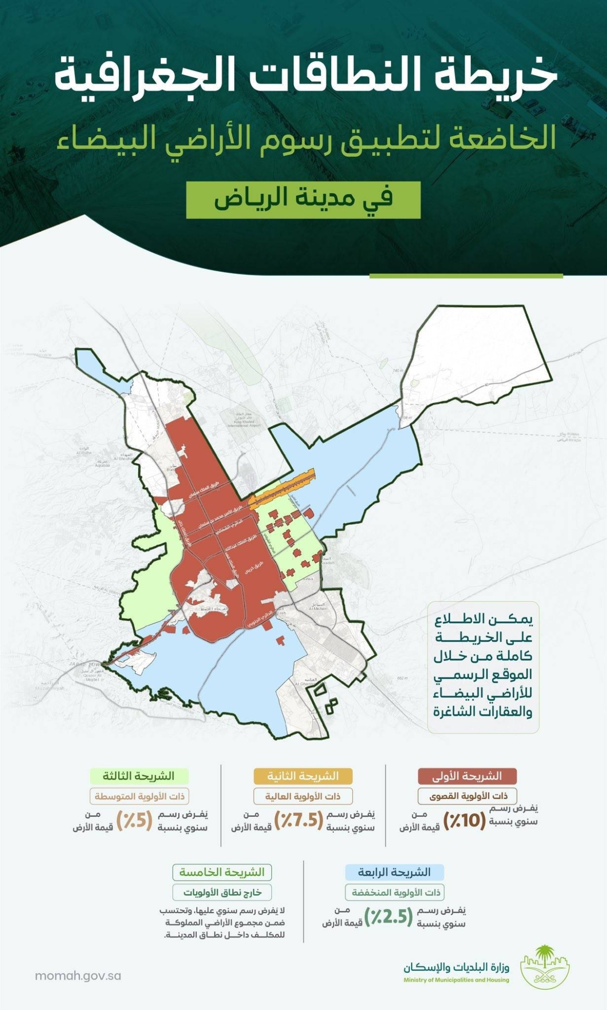 - إطلاق خرائط النطاقات الجغرافية لرسوم الأراضي البيضاء في مدينة الرياض جاء استكمالاً لتوجيهات ولي العهد -حفظه الله- باتخاذ الإجراءات اللازمة لتحقيق التوازن في القطاع العقاري بمدينة الرياض والحد من المُمارسات الاكتنازية للأراضي داخل النطاق العمراني بما يُساهم في زيادة المعروض وتنشيط حركة البيع والشراء.