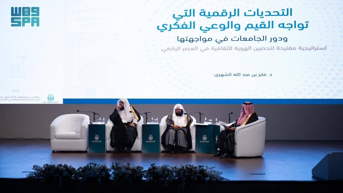 واختتمت الجلسات في يومها الأول، بجلسة عن مسؤولية الجامعات السعودية في تعزيز القيم والوعي الفكري في المجتمع ومؤسساته من خلال الشراكات الاستراتيجية بين الجامعات السعودية والمؤسسات الدينية في تعزيز القيم والوعي الفكري، وتنشيط النشر الإعلامي، ورفع الوعي المجتمعي وتحفيز المشاركة المجتمعية، والتفاعل مع مخرجات المؤتمر ورسائله الإعلامية عبر منصات التواصل الاجتماعي، ودور الجامعات في تعزيز القيم والوعي الفكري بين الأصالة والمعاصرة، والتحديات العالمية والرقمية التي تواجه القيم والوعي الفكري، وإبراز جهود المملكة في تعزيز القيم الإنسانية والوعي الفكري، إضافة إلى إيجاد منصة معرفية وعلمية مستدامة لمشاركة الأبحاث والدراسات المتخصصة في القيم والوعي الفكري، واستشراف مسؤولية الجامعات في تعزيز القيم والوعي الفكري بما يواكب تطلعات رؤية المملكة 2030.