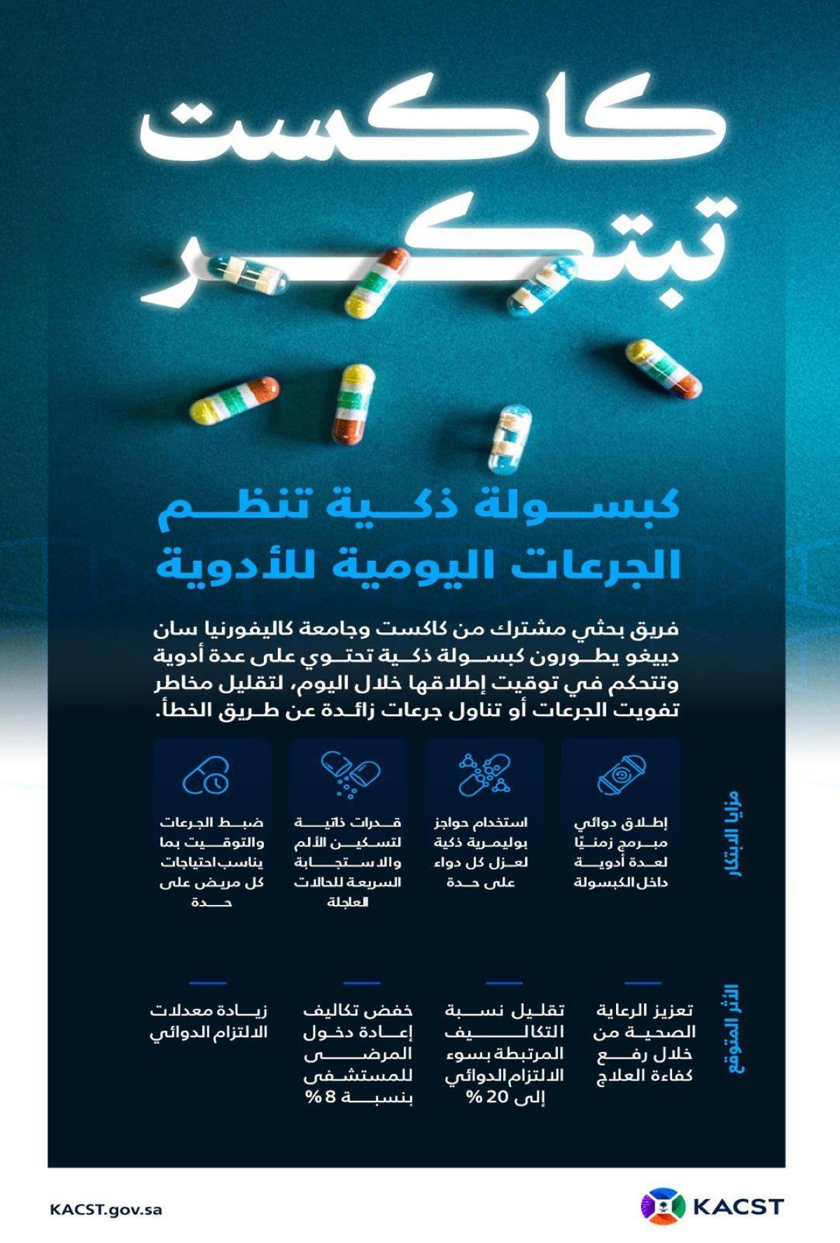 تمكن فريق بحثي مشترك من مدينة الملك عبدالعزيز للعلوم والتقنية «كاكست»، وجامعة كاليفورنيا سان دييغو؛ من ابتكار كبسولة ذكية متعددة الأجزاء تحتوي على الأدوية التي يحتاجها المريض خلال اليوم.
