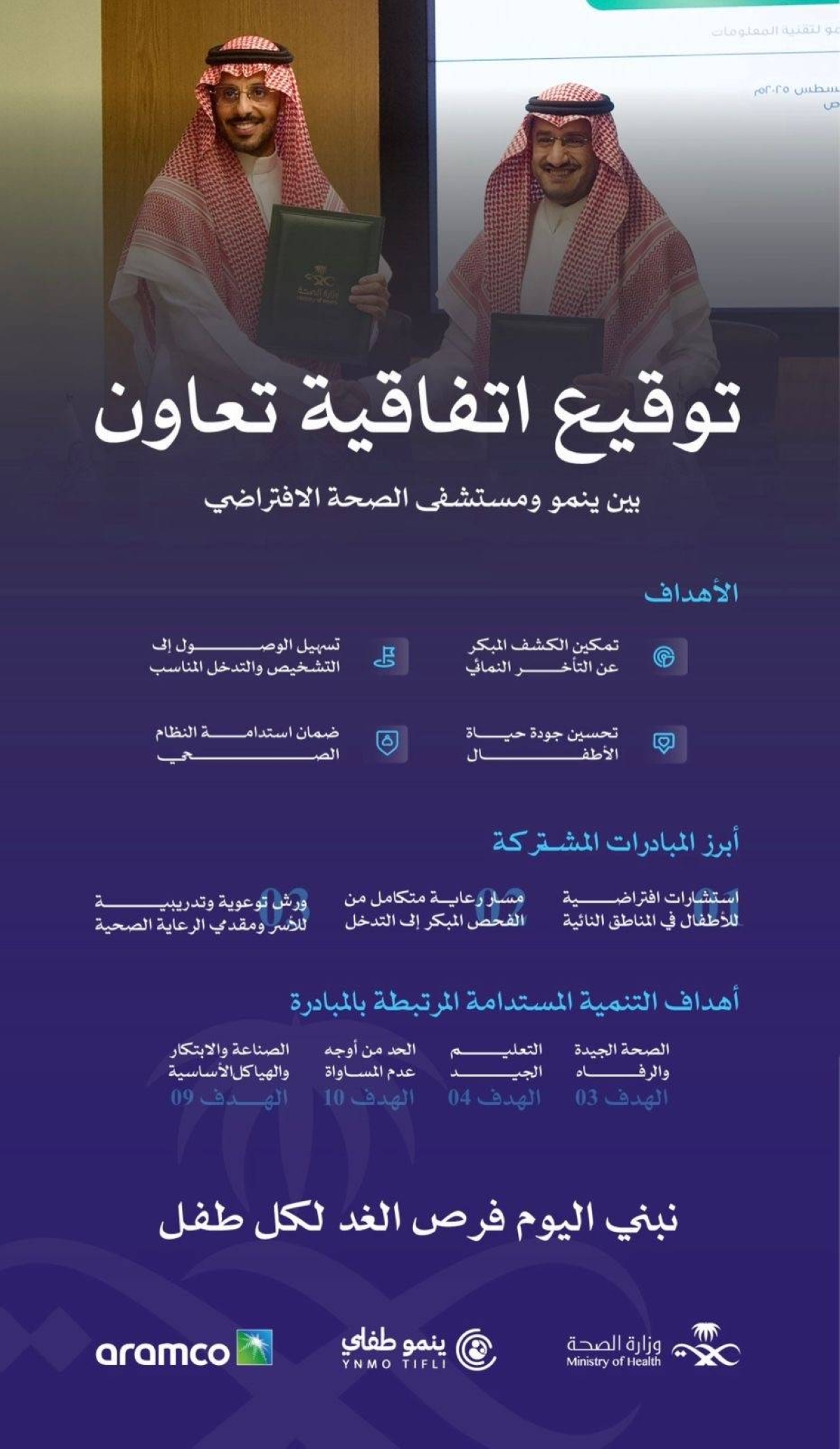 في خطوة وطنية واعدة نحو تمكين مستقبل أكثر صحةً ونماءً لأطفال المملكة، أعلنت مبادرة “ينمو طفلي” الوطنية بدعم من أرامكو توقيع اتفاقية تعاون مع وزارة الصحة السعودية المتمثلة في قسم مستشفى الصحة الافتراضي، بهدف توسيع أثر التدخل المبكر في مجال التأخر النمائي، ورفع كفاءة الوصول إلى التشخيص والدعم المناسب، بما يعزز جودة حياة الطفل، ويحقق الاستدامة في النظام الصحي.