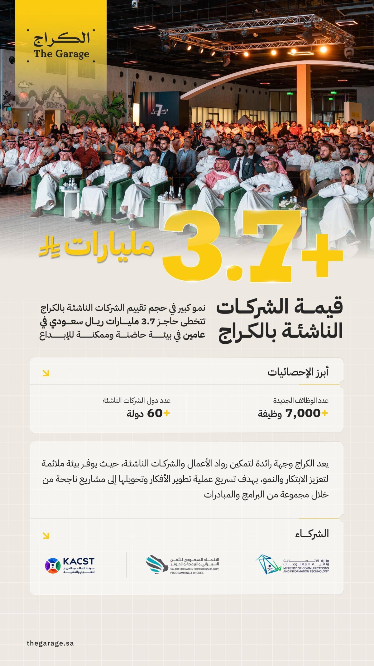 تجاوز حجم تقييم الشركات الناشئة للكراج 3.7 مليارت ريال، ضمن برنامجي «الحاضنة» و «المسرعة»؛ لتسريع نمو الشركات الناشئة في مختلف المجالات التقنية، إذ يوفر الكراج بيئة محفزة وداعمة للابتكار، مما يعزز من قدرة المبتكرين ورواد الأعمال على تحقيق أهدافهم.