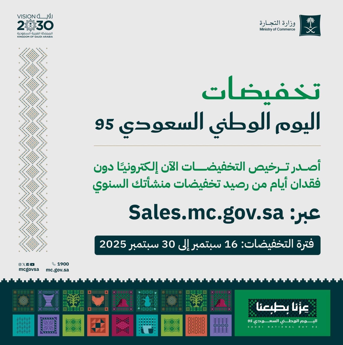 أعلنت وزارة التجارة عن إتاحة التقديم للحصول على تراخيص التخفيضات الموسمية لليوم الوطني الـ95، للمنشآت التجارية والمتاجر الالكترونية بشكل الكتروني من خلال الرابط: https://sales.mc.gov.sa/.