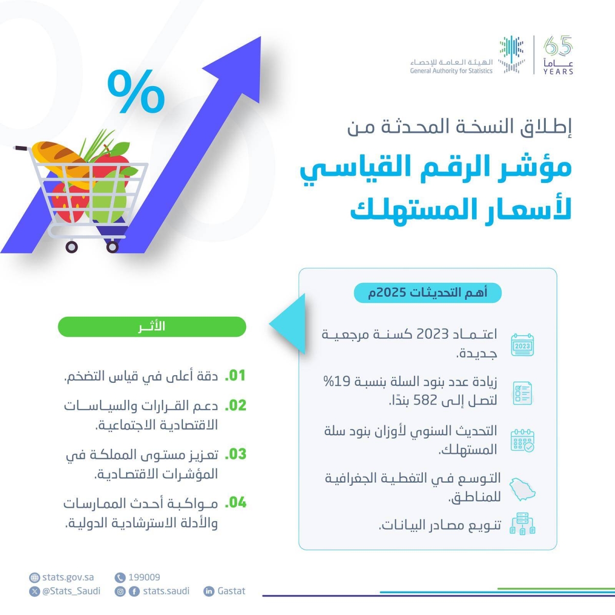 وفي هذا الإطار، أوضحت الهيئة العامة للإحصاء، أن تطوير منهجية الرقم القياسي لأسعار المستهلك جاء لتعزيز دقة قياس التضخم الفعلي في الاقتصاد السعودي ومنسجمة مع أفضل الممارسات العالمية والأدلة الاسترشادية الدولية ذات العلاقة، ومن أبرز التحديثات التي اشتملت عليها هذه المنهجية تطوير آلية جمع بيانات الأسعار وأوزان سلة المستهلك وتنويع مصادرها؛ حيث تستند الأوزان إلى بيانات مسح إنفاق ودخل الأسرة لعام 2023م، إضافة إلى بيانات الإنفاق الاستهلاكي العائلي في الحسابات القومية، وبيانات منصة إيجار، وبيانات سجلية أخرى لعدد من الجهات، وحدثت السنة المرجعية للمؤشر من 2018م إلى 2023م بما يضمن عكس المؤشر للواقع الفعلي لأنماط الإنفاق.
