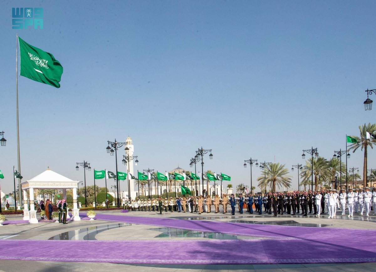وقد أجريت له مراسم الاستقبال الرسمية، حيث رافقت الخيول العربية موكبه، وعزف السلامان الوطني الباكستاني والملكي السعودي، واستعرض دولته مع ولي العهد حرس الشرف.