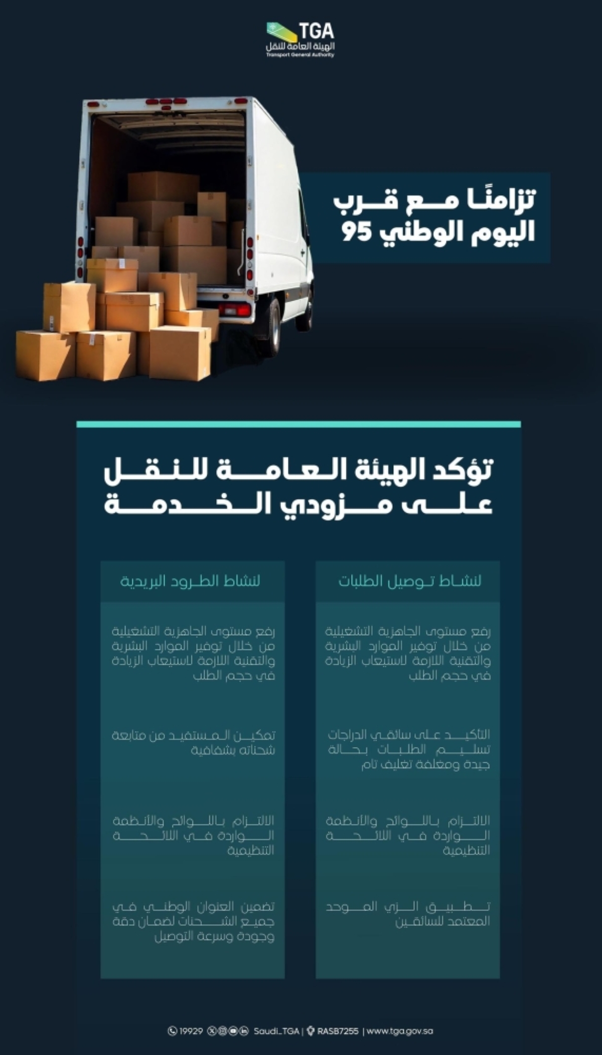 أكدت الهيئة العامة للنقل - تزامنا مع قرب اليوم الوطني الـ95 للمملكة - على مزودي خدمات توصيل الطلبات، والطرود البريدية بضرورة الالتزام بالمتطلبات النظامية؛ بهدف تعزيز جودة الخدمات المقدمة للمستفيدين، والإسهام في تطوير قطاع التوصيل والطرود البريدية، ورفع كفاءته التشغيلية.