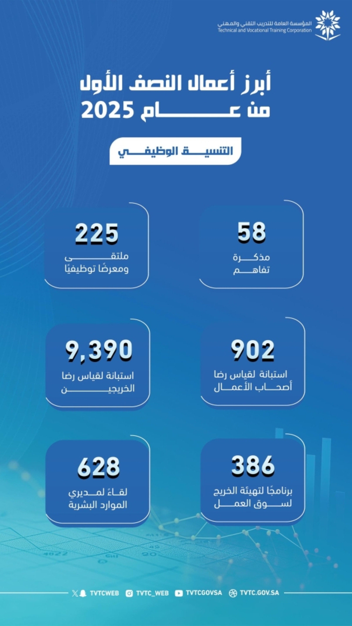 وأفاد بأن من تلك الجهود إقامة 225 ملتقى ومعرضا للتوظيف بالشراكة مع عدد من الجهات في النصف الأول من العام الحالي، إضافة لعقد 628 لقاء مع مديري الموارد البشرية في جهات التوظيف المستهدفة بقطاع الأعمال، وتوقيع 58 مذكرة تفاهم مع شركاء المؤسسة من القطاعين الحكومي والخاص للإسهام في توظيف الخريجين.