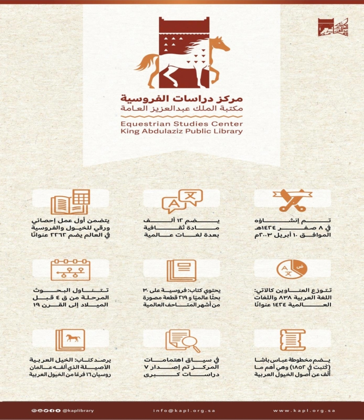 وأسست المكتبة مركز دراسات الفروسية، الذي يعد نقطة معرفية مضيئة في دراسة الخيول العربية والفروسية، وكل ما يتعلق بها من معلومات ومعارف، لها حضورها التراثي وتجلياتها في الواقع المعاصر.