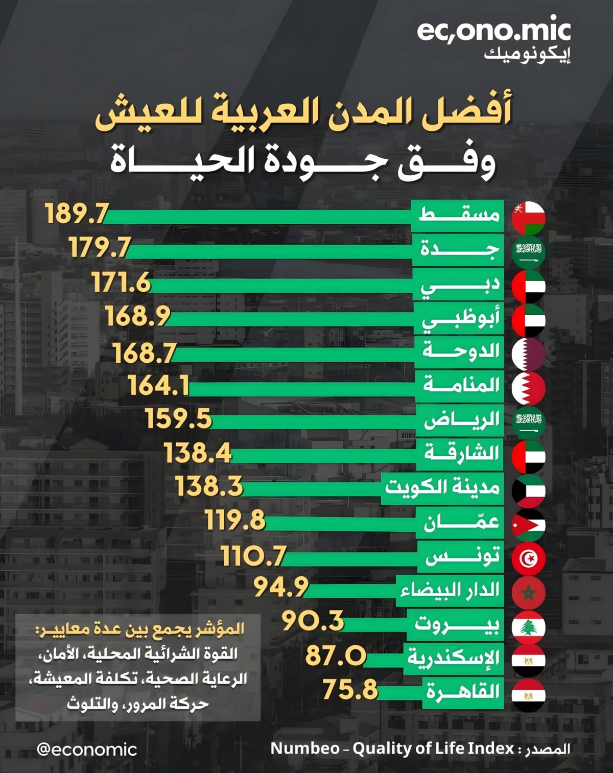 تصدرت جدة المرتبة 74 عالميا في مؤشر جودة الحياة لعام 2025 وفق بيانات Numbeo، وهي أعلى المدن السعودية على المؤشر، والثانية عربيا بعد مسقط، وجاء ذلك نتيجة التحسينات المستمرة في الأمان والرعاية الصحية، وتطوير البنية التحتية، وتوفير مرافق عامة حديثة، والتزام المدينة بتحويل النهضة التنموية إلى واقع ملموس يخدم السكان والزوار.
