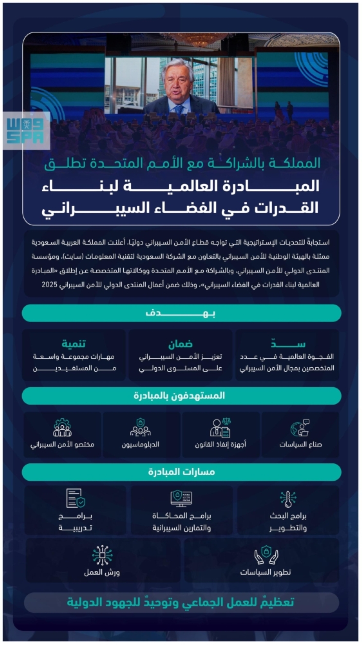 أعلنت المملكة العربية السعودية ممثلة بالهيئة الوطنية للأمن السيبراني بالتعاون مع الشركة السعودية لتقنية المعلومات (سايت)، ومؤسسة المنتدى الدولي للأمن السيبراني، وبالشراكة مع الأمم المتحدة ووكالاتها المتخصصة عن إطلاق المبادرة العالمية لبناء القدرات الدولية في الفضاء السيبراني.