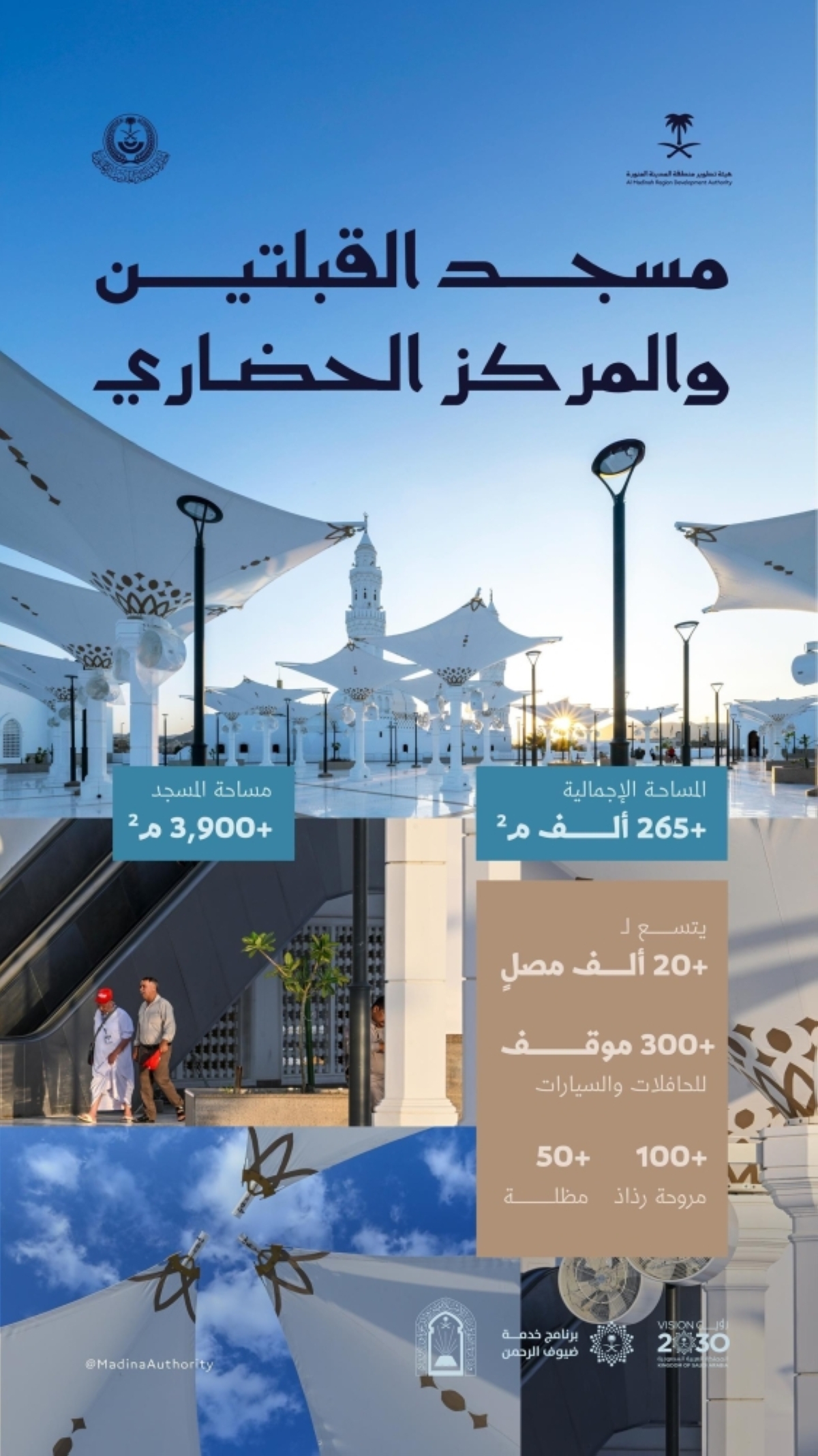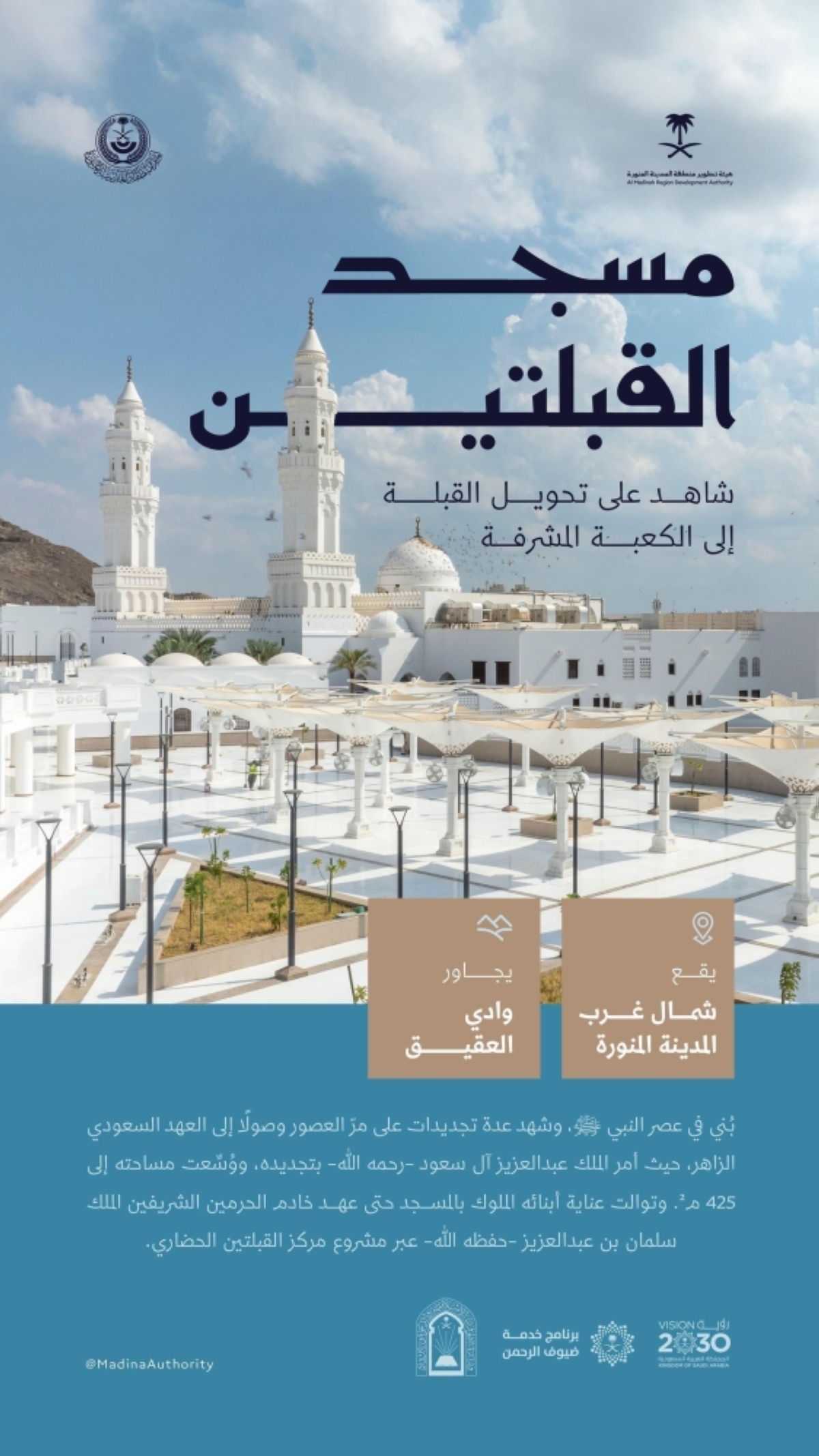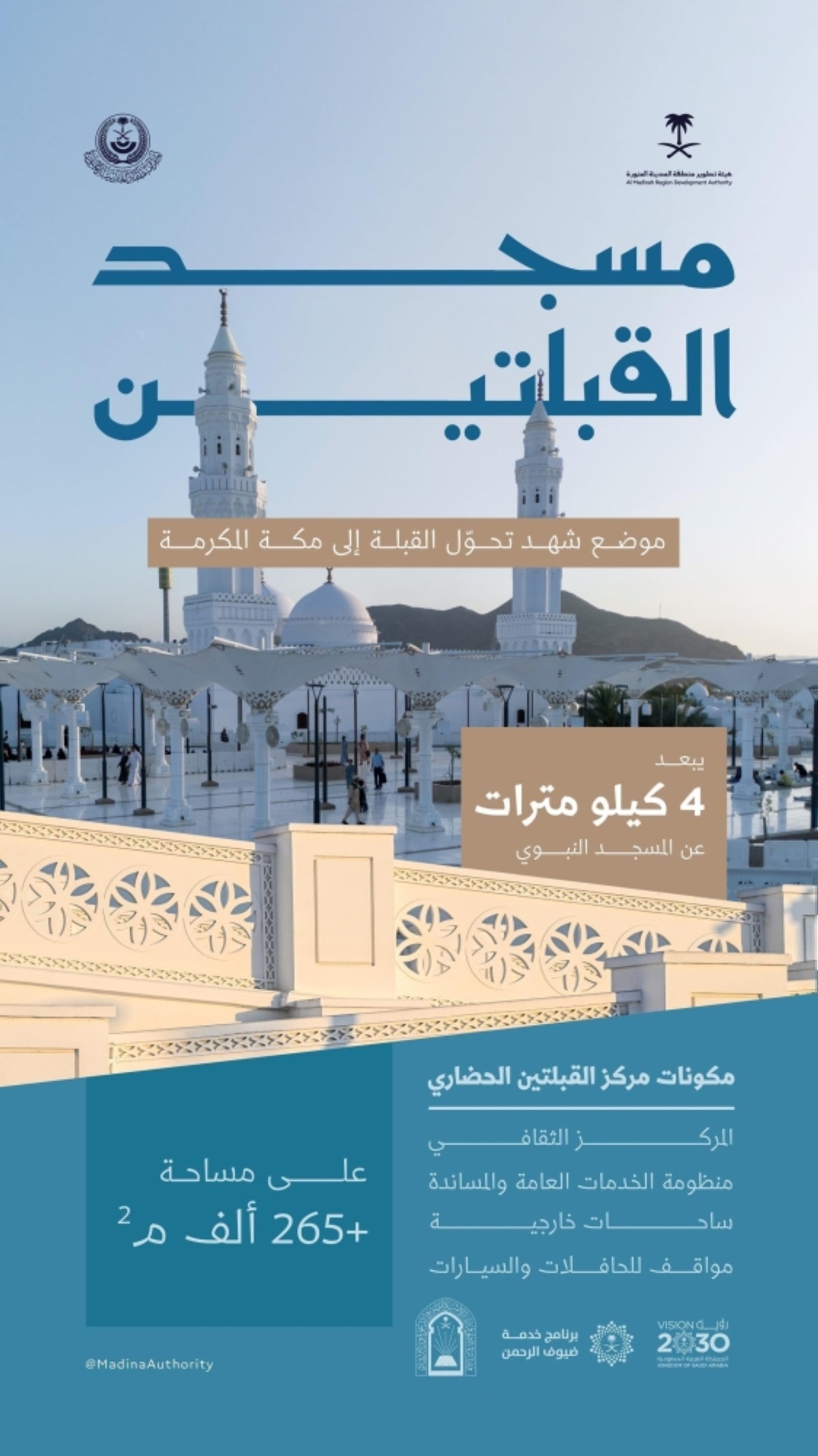 يشار إلى أنه يجسد مشروع «مسجد ومركز القبلتين الحضاري» بالمدينة المنورة التكامل بين العناية الدينية والتطوير الحضاري، ليبقى المسجد منارة إيمانية وتاريخية، تخلد ذكرى تحويل القبلة، وتضيء طريق الزائرين إلى المدينة المنورة عبر العصور.
