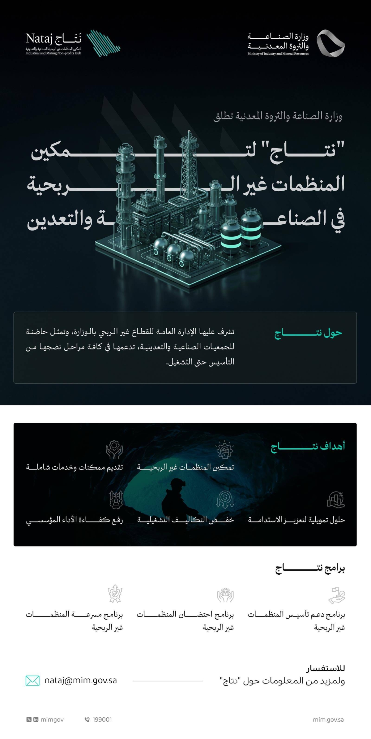 أعلنت وزارة الصناعة والثروة المعدنية إطلاق «نتاج» لتمكين المنظمات غير الربحية في قطاعي الصناعة والتعدين، وتعظيم دورها في التنمية الاقتصادية بالمملكة، وفقا لمستهدفات رؤية السعودية 2030.