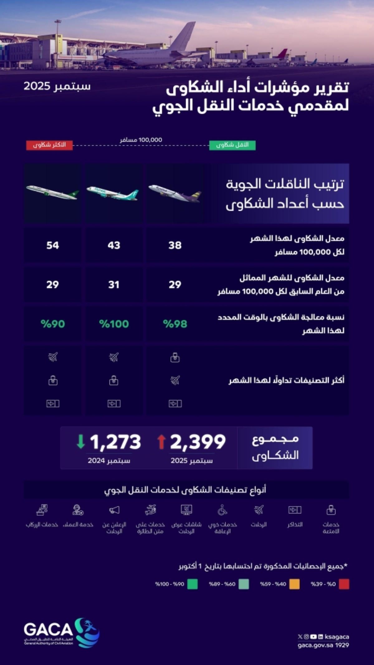 وأوضحت أن عدد شكاوى المسافرين على الناقلات الجوية بلغ 2399 شكوى، مبينة أن «طيران أديل» جاء أقل شركات الطيران شكاوى بواقع 38 شكوى لكل 100 ألف مسافر، وبنسبة معالجة للشكوى بالوقت المحدد لشهر سبتمبر إلى 98%، بينما حل طيران ناس ثانيا بواقع 43 شكوى لكل 100 ألف مسافر، وبنسبة معالجة للشكوى بالوقت المحدد إلى 100%، وجاءت ثالثا الخطوط الجوية السعودية، حيث وصل عدد الشكاوى إلى 54 شكوى لكل 100 ألف مسافر، وبنسبة معالجة للشكوى بالوقت المحدد إلى 90%، وجاءت أكثر تصنيفات الشكاوى تداولا لشهر سبتمبر عن الرحلات أولا، ثم خدمات الأمتعة، ثم التذاكر.