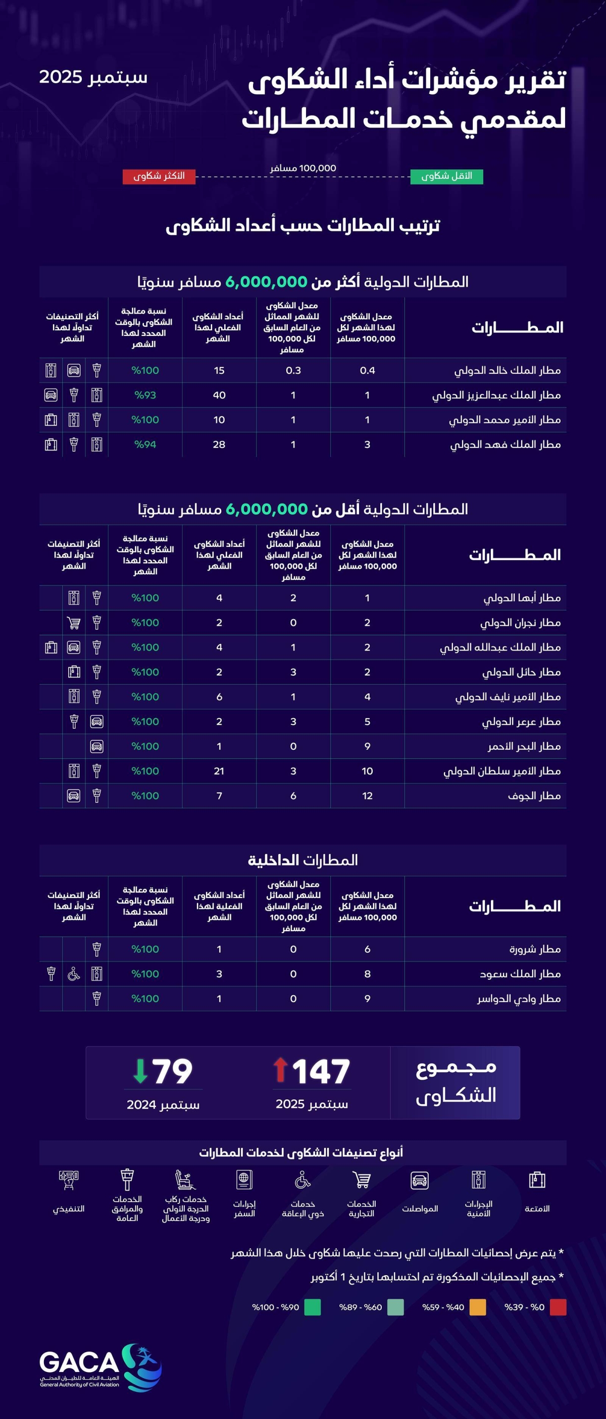 وأشارت الهيئة إلى حصول مطار الملك خالد الدولي بالرياض على أقل المطارات من حيث الشكاوى المرفوعة للهيئة بما نسبته 0.4% لكل 100 ألف مسافر، وذلك في المؤشر الخاص بالمطارات الدولية التي يزيد أعداد المسافرين فيها على 6 ملايين مسافر سنويا، وبواقع 15 شكوى، وبنسبة معالجة للشكاوى بالوقت المحدد وصلت إلى 100%.