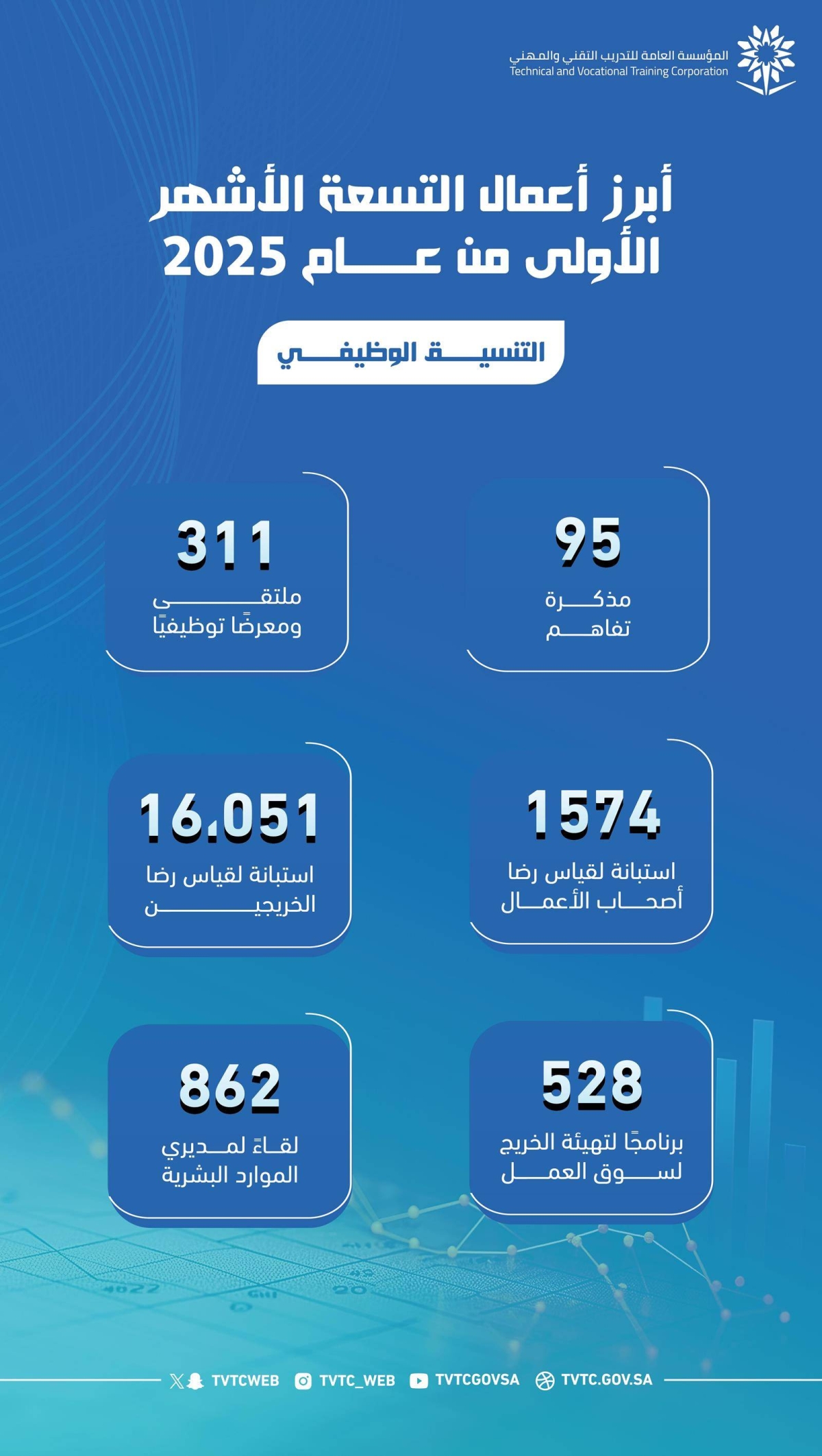 أقامت المؤسسة العامة للتدريب التقني والمهني 311 ملتقى ومعرضا للتوظيف بالشراكة مع عدة جهات خلال فترة الأشهر التسعة الأولى من العام الحالي 2025م، وذلك ضمن الجهود التي تبذلها في التنسيق الوظيفي لخريجي وخريجات الكليات التقنية والمعاهد الصناعية والعمارة والتشييد الثانوية.