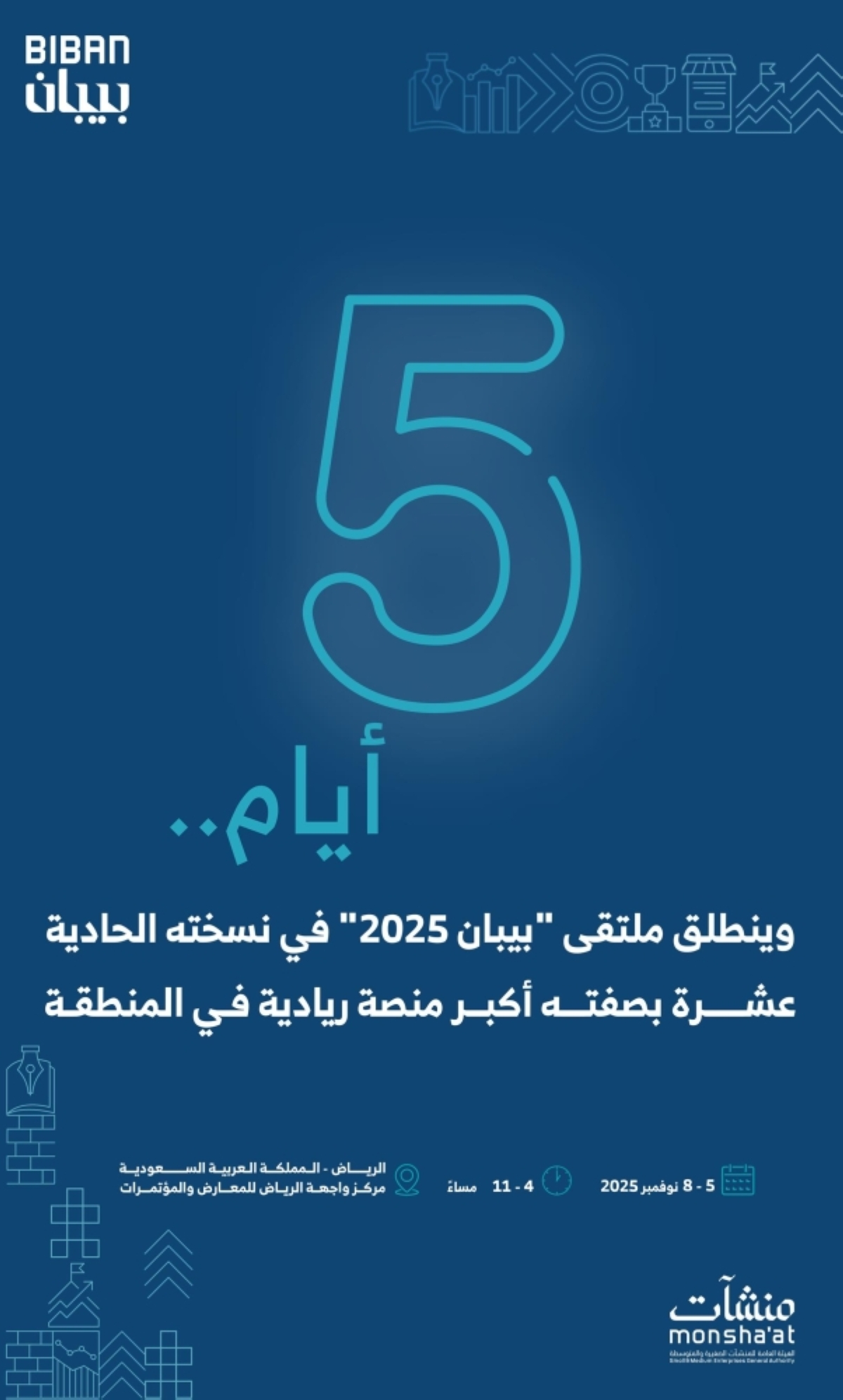 تنطلق الأربعاء المقبل فعاليات ملتقى «بيبان 2025» الذي تنظمه الهيئة العامة للمنشآت الصغيرة والمتوسطة «منشآت» خلال الفترة من 5 إلى 8 نوفمبر المقبل في مركز واجهة الرياض للمعارض والمؤتمرات، تحت شعار «وجهة عالمية للفرص»، بمشاركة أكثر من 150 دولة، و200 متحدث محلي وعالمي، إلى جانب 150 جهة ممكنة من القطاعين الحكومي والخاص، إضافة إلى إعلان عدة إطلاقات واتفاقيات ملياريه.