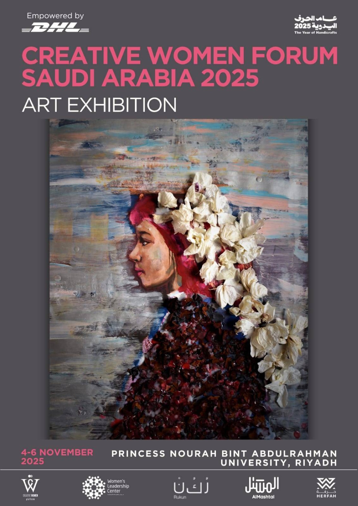 The Art Exhibition is an art initiative by the Creative Women Forum Saudi Arabia, taking place from 4–6 November 2025 at Princess Nourah bint Abdulrahman University in Riyadh, under the royal patronage of HRH Princess Noura bint Saud bin Naif bin Abdulaziz Al Saud. In partnership with the Women’s Leadership Centre, this year’s Forum is held under the theme “Empower • Engage • Sustain – Women Leading Initiatives.” It will bring together over 500 global delegates, visionary entrepreneurs, innovators, and thought leaders from business, academia, science, the arts, and government to explore creativity, sustainability, and leadership in an evolving world.