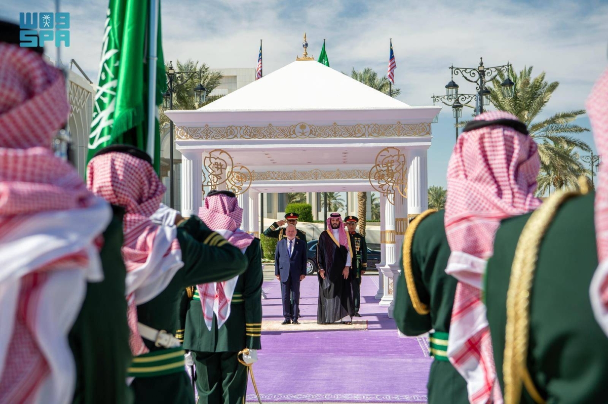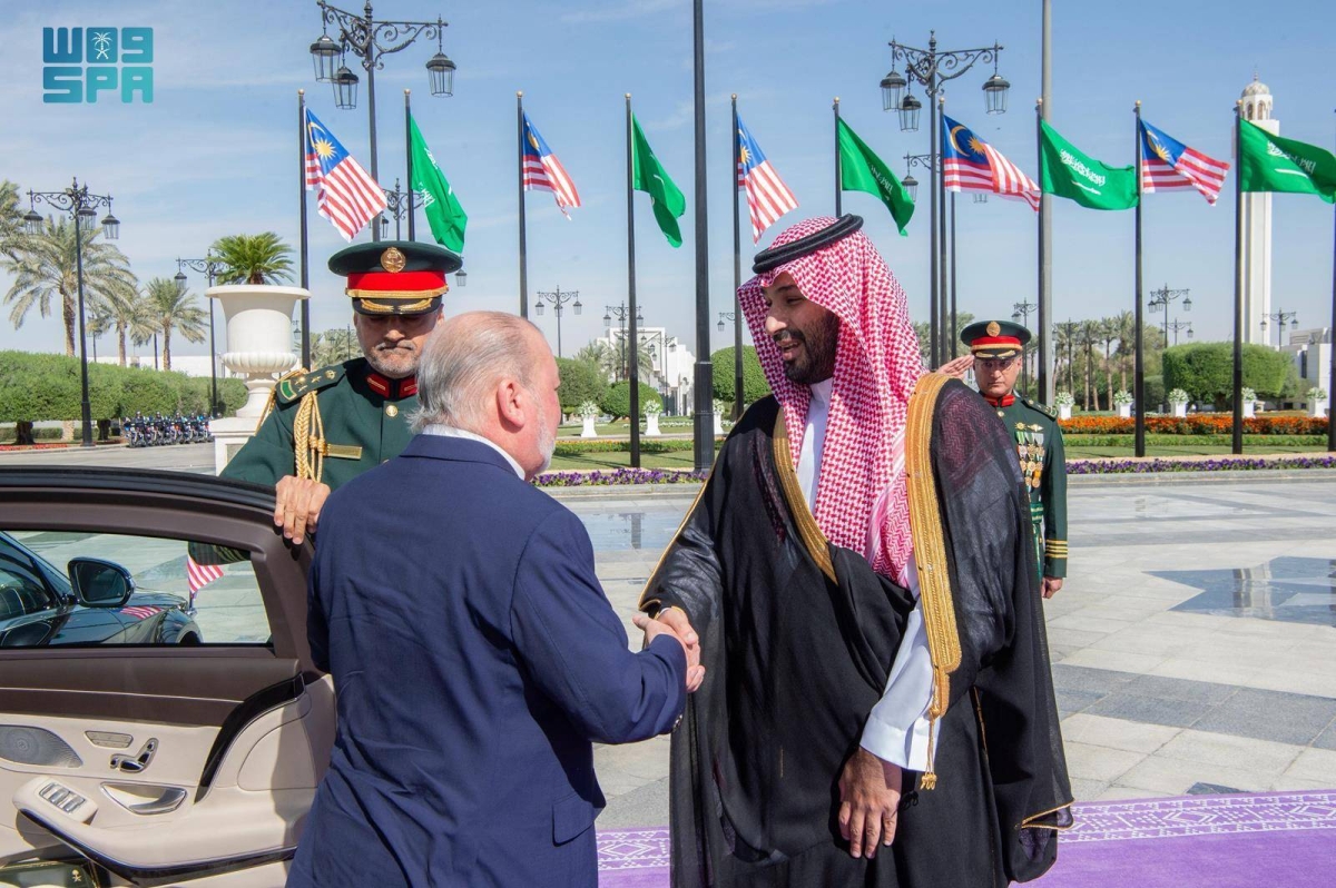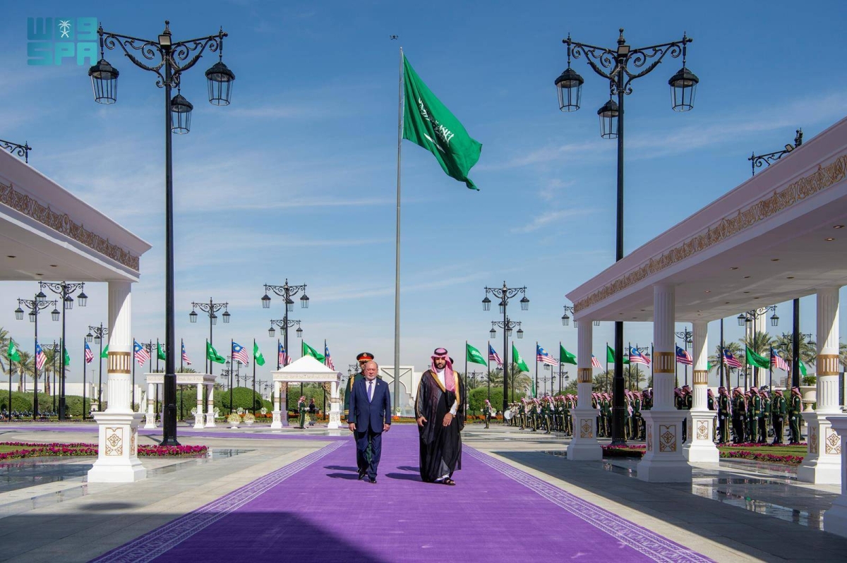 وقد أجريت له مراسم الاستقبال الرسمية، وعزف السلامان الملكيان السعودي والماليزي، واستعرض مع ولي العهد حرس الشرف.