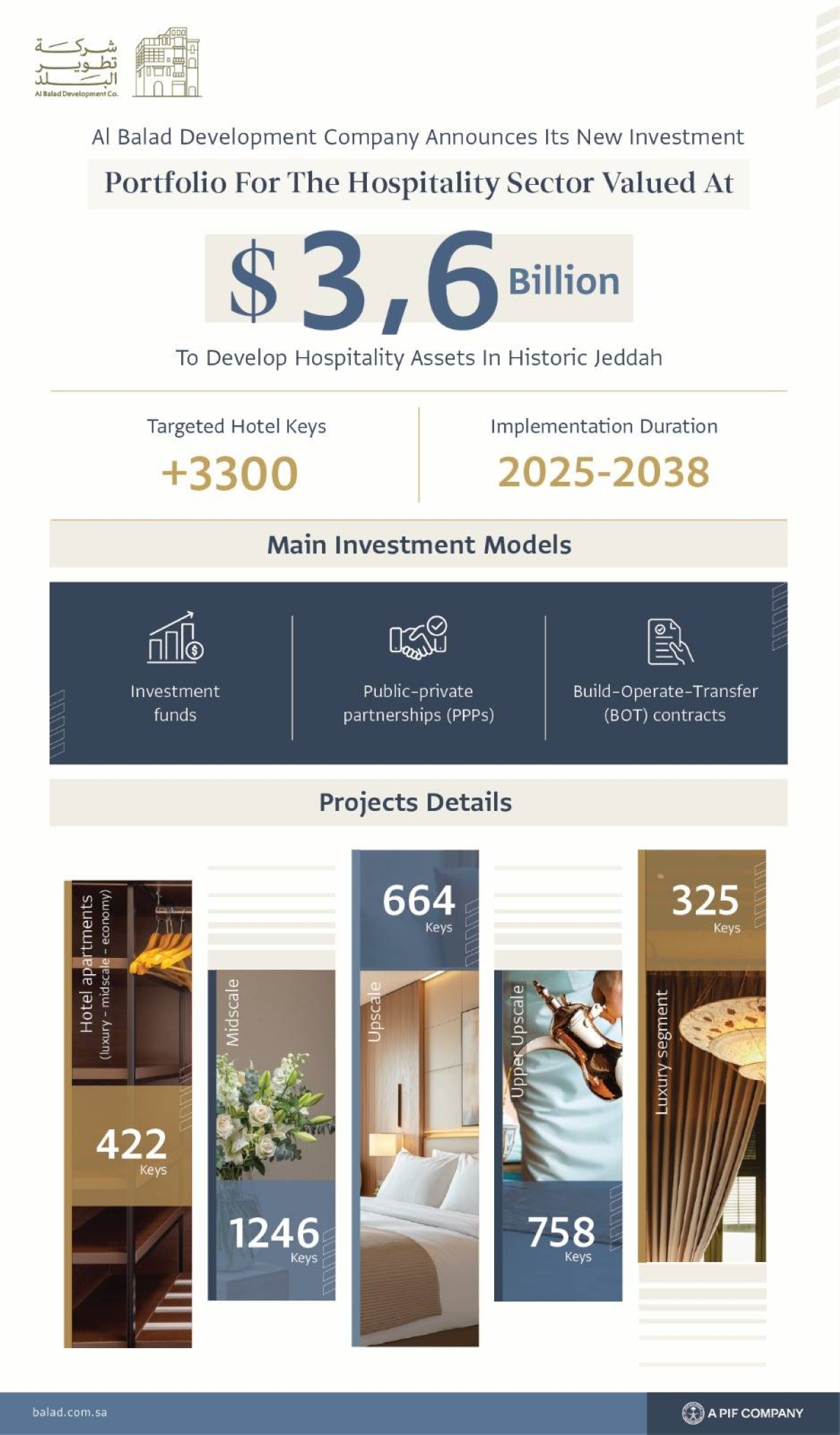 وتهدف تطوير البلد من خلال محفظتها التي تمتد مشاريعها من عام 2025 وحتى عام 2038، إلى تطوير أكثر من 3,300 وحدة فندقية عبر فئات متنوعة من المتوسطة إلى الفاخرة، من خلال نماذج استثمار وتمويل مرنة تشمل الشراكات بين القطاعين العام والخاص، وصناديق الاستثمار. ويُعد هذا الإعلان خطوة استراتيجية للمساهمة في تطوير جدة التاريخية وإعادة إحيائها كوجهة سياحية وثقافية عالمية تجمع بين التراث والاقتصاد المستدام.