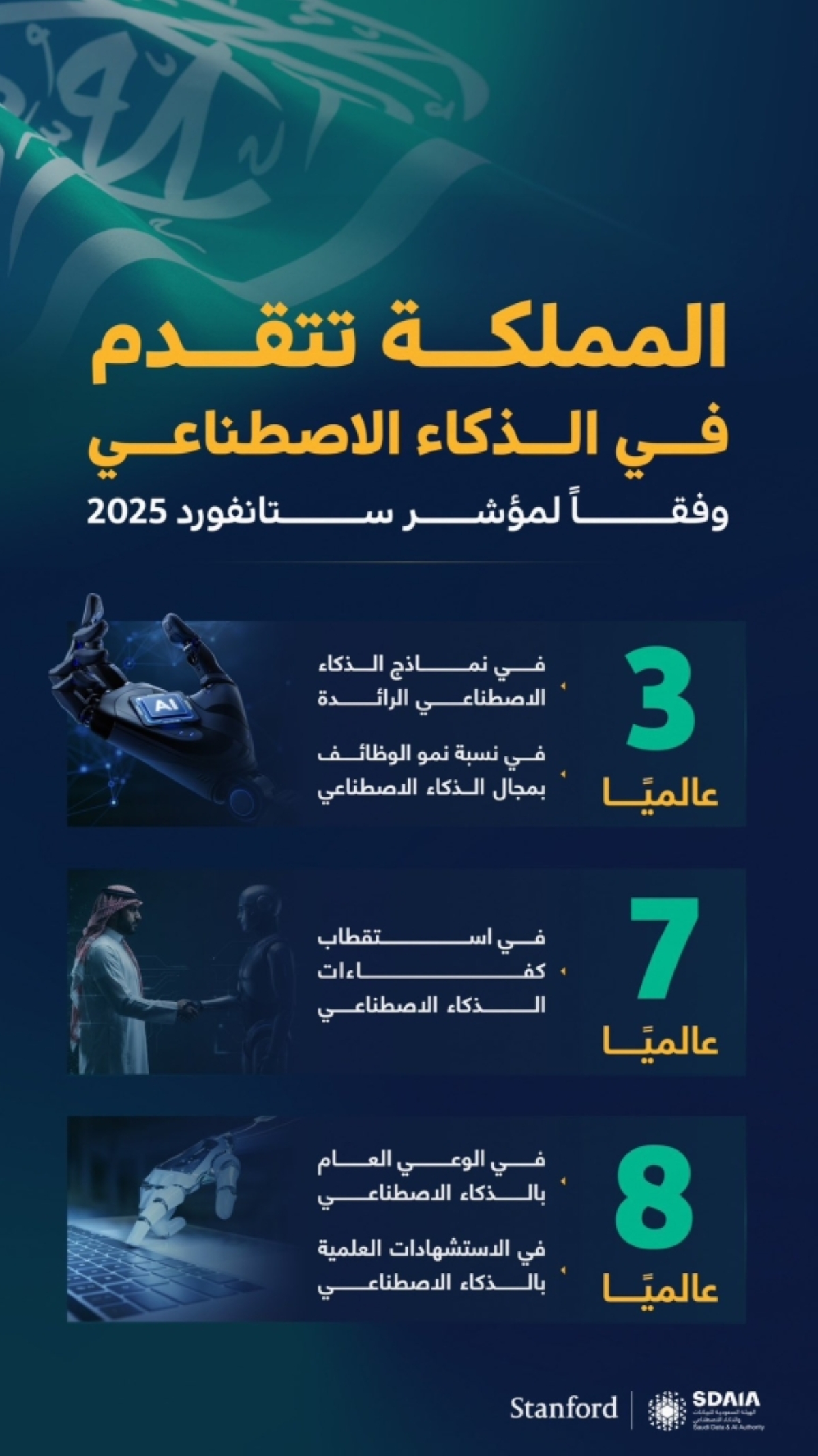 حلت المملكة العربية السعودية المرتبة الثالثة عالميا في نماذج الذكاء الاصطناعي الرائدة وفي نسبة نمو الوظائف في مجال الذكاء الاصطناعي، وذلك بعد أمريكا والصين في النماذج اللغوية، وبعد الهند والبرازيل في نسبة نمو الوظائف المتعلقة بالذكاء الاصطناعي، وفقا لمؤشر الذكاء الاصطناعي التابع لمعهد ستانفورد للذكاء الاصطناعي المتمركز حول الإنسان لعام 2025.