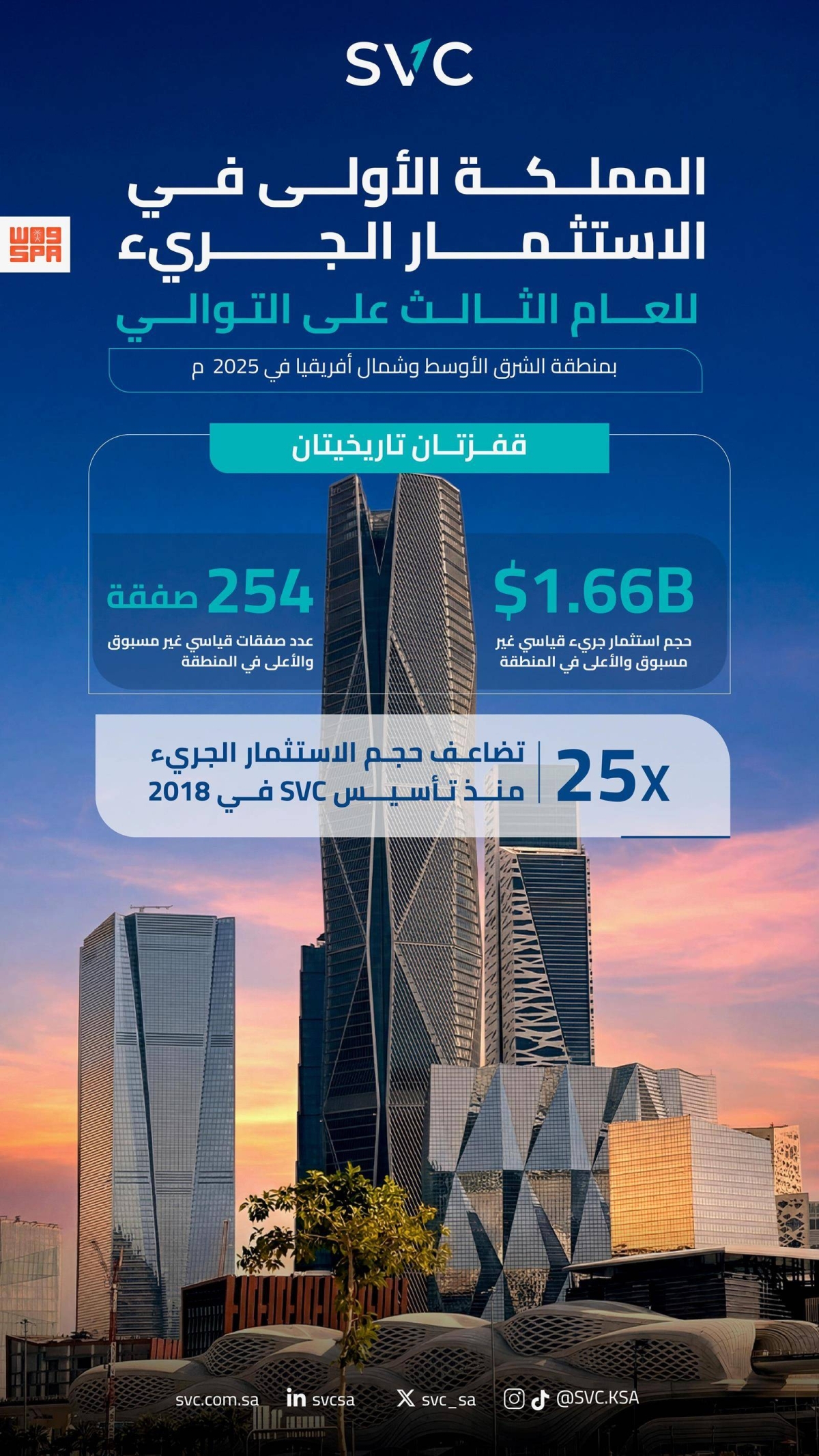 أعلنت الشركة السعودية للاستثمار الجريء (SVC) أن الاستثمار الجريء في المملكة العربية السعودية حقق خلال 2025 قفزتين تاريخيتين، من حيث حجم الاستثمار وعدد الصفقات، في حين عززت المملكة صدارتها في منطقة الشرق الأوسط للعام الثالث على التوالي، من حيث حجم الاستثمار الجريء، في أثر واضح لرؤية المملكة 2030.