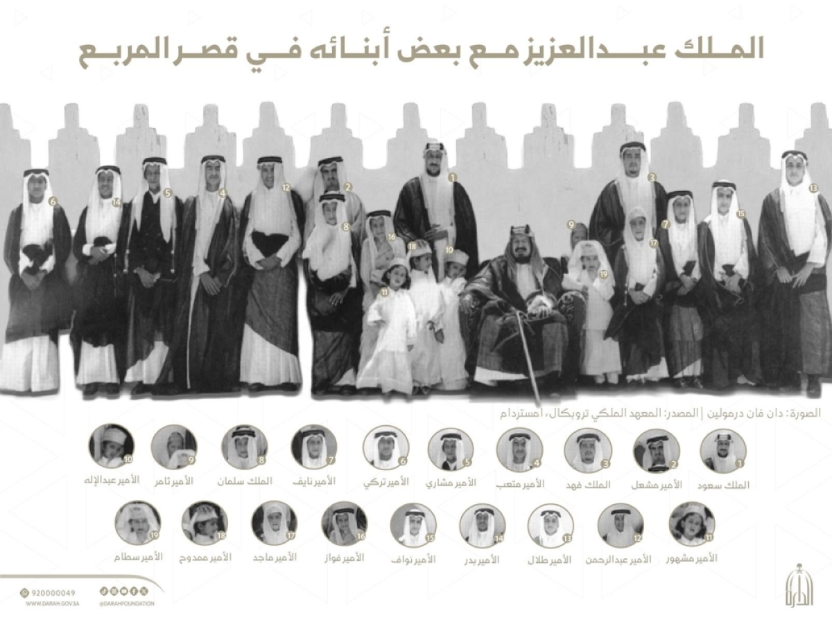 نشرت دارة الملك عبدالعزيز صورة تاريخية تظهر الملك عبدالعزيز بن عبدالرحمن آل سعود - رحمه الله - مع عدد من أبنائه على سطح قصر المربع في الرياض، ضمن مجموعة من الصور والوثائق التاريخية المحفوظة لديها.