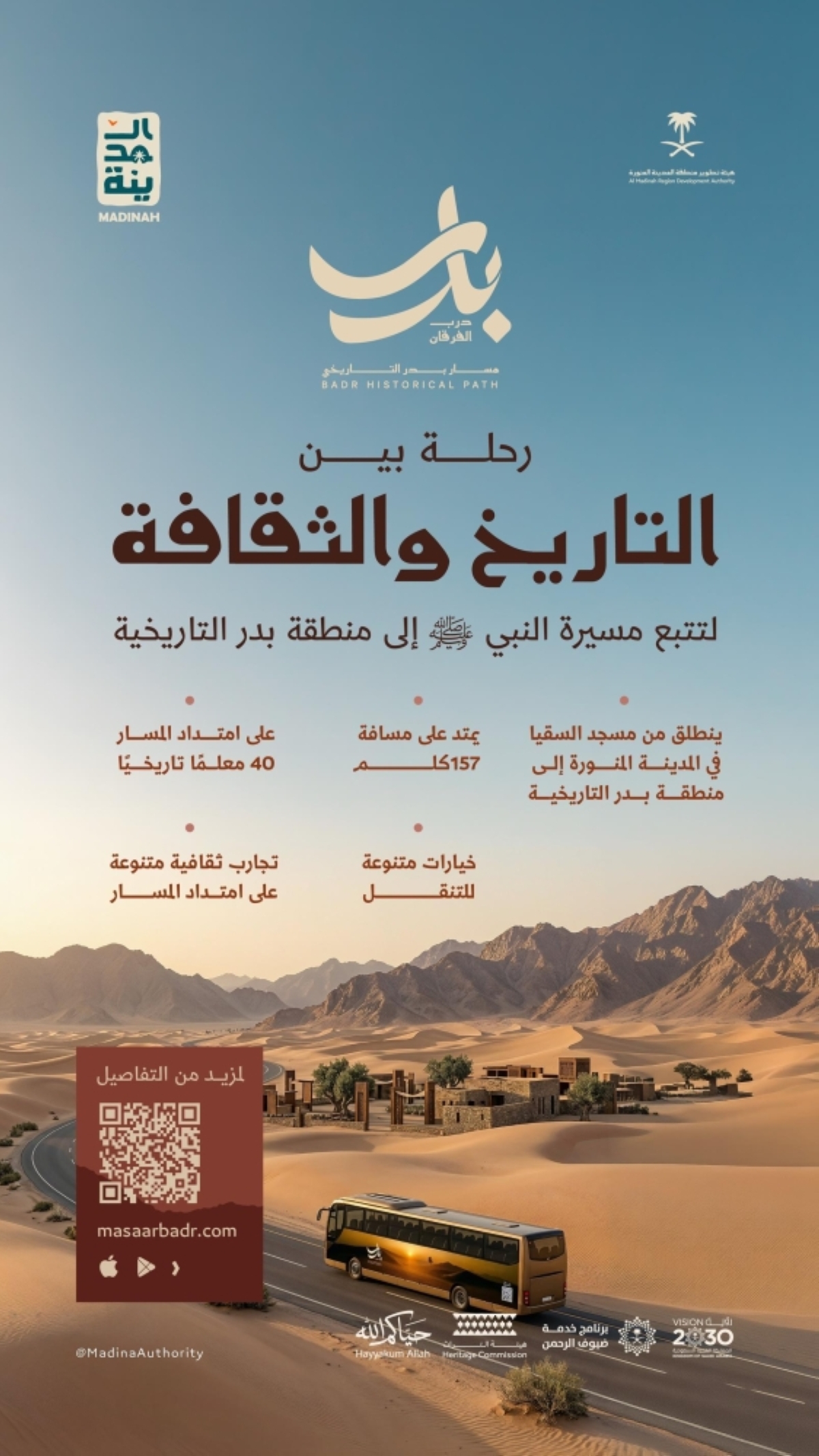 أطلقت هيئة تطوير منطقة المدينة المنورة، بالشراكة مع برنامج خدمة ضيوف الرحمن - أحد برامج تحقيق رؤية المملكة 2030 -، مشروع «مسار بدر»، الذي يعد أحد المشاريع النوعية الهادفة إلى إحياء المواقع التاريخية المرتبطة بالأحداث التاريخية لمسار درب الفرقان، وتقديم تجربة معرفية وثقافية متكاملة تستحضر مسير النبي - صلى الله عليه وسلم - من المدينة المنورة إلى بدر، ضمن جهود الهيئة بالتعاون مع شركائها لإثراء تجربة ضيوف الرحمن وتعزيز حضور المواقع التاريخية المرتبطة بالسيرة النبوية.