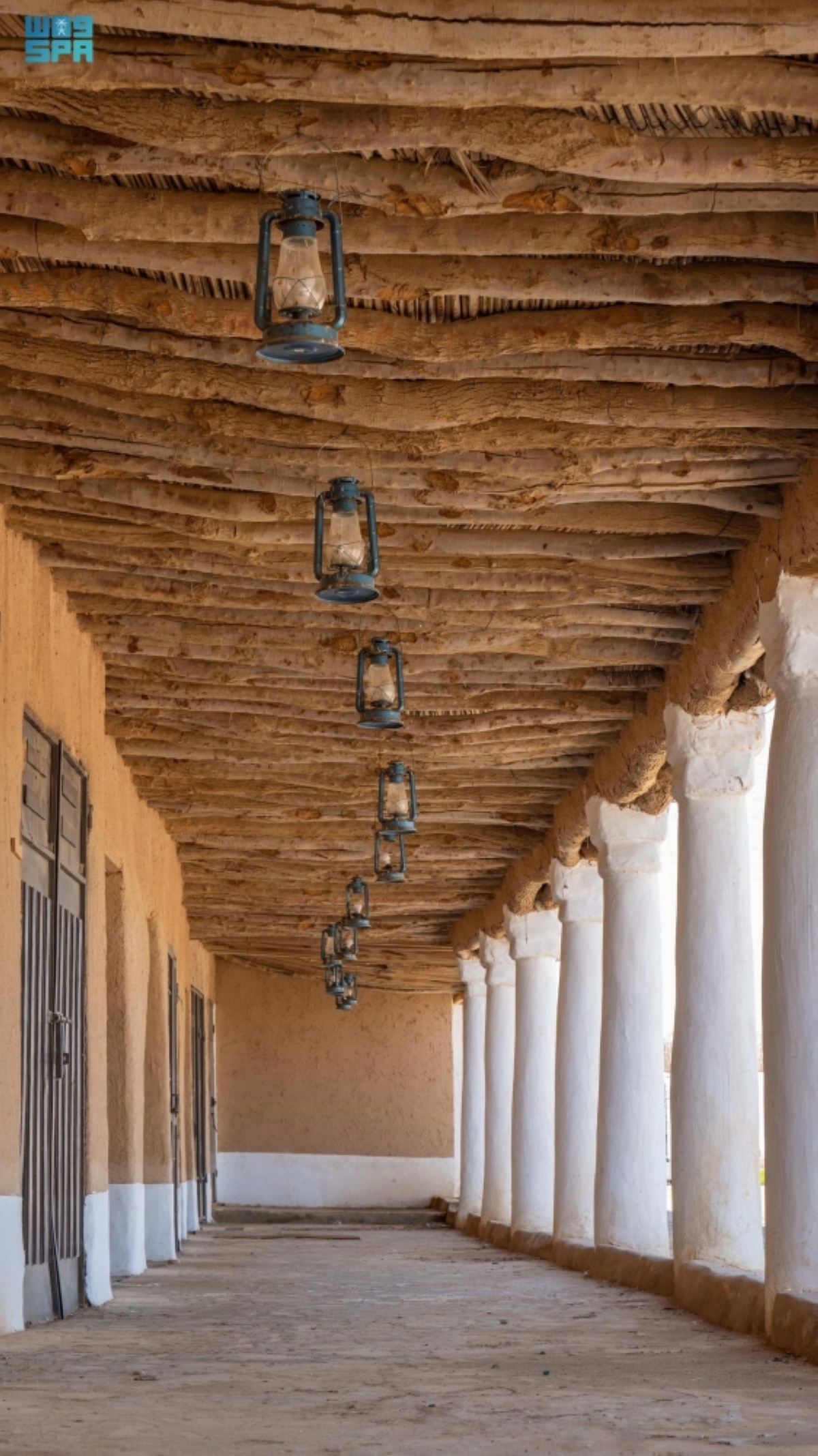 وتبرز في تفاصيلها الممرات الطولية المسقوفة بجذوع الأشجار وسعف النخيل، والمحمولة على أعمدة طينية مطلية بالجص الأبيض، في تصميم يجمع بين البساطة والدقة، ويؤدي وظائف بيئية فاعلة من حيث التهوية وتلطيف درجات الحرارة، فيما تعكس الفوانيس المعلّقة على امتداد السقوف جانبا من وسائل الإضاءة التقليدية التي كانت جزءا من الحياة اليومية.