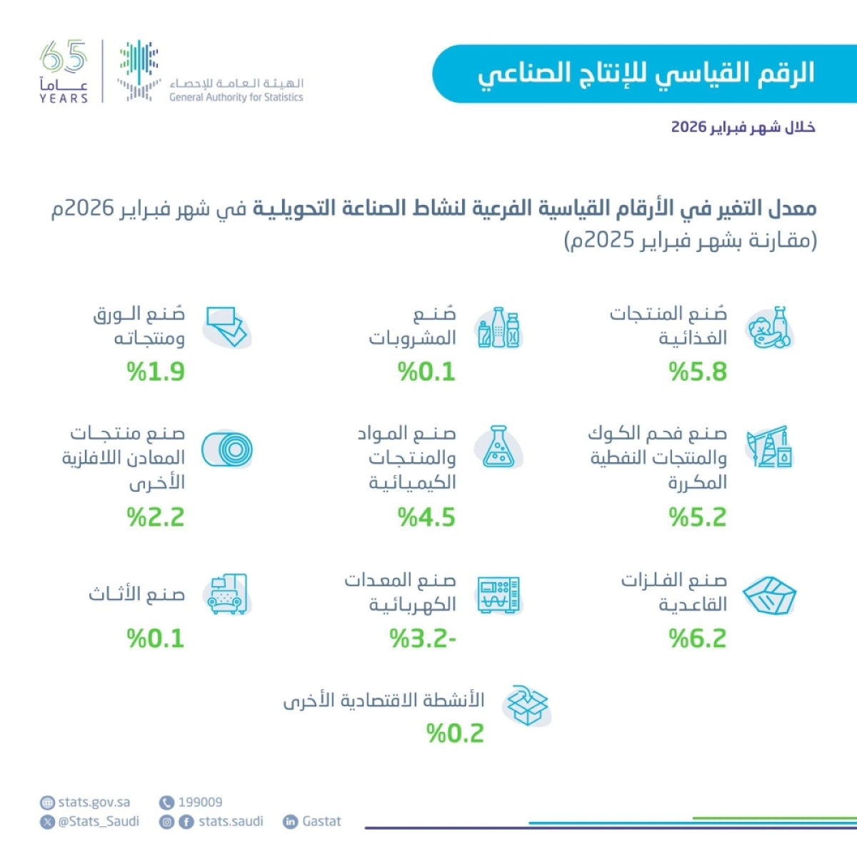 أصدرت الهيئة العامة للإحصاء نتائج مؤشر الرقم القياسي للإنتاج الصناعي لشهر فبراير 2026م، التي أظهرت ارتفاع المؤشر بنسبة 8.9% مقارنة بالشهر المماثل من العام السابق مدعوما بنمو نشاط التعدين واستغلال المحاجر، ونشاط الصناعة التحويلية، وأنشطة إمدادات المياه، والصرف الصحي، وإدارة النفايات، ومعالجتها.