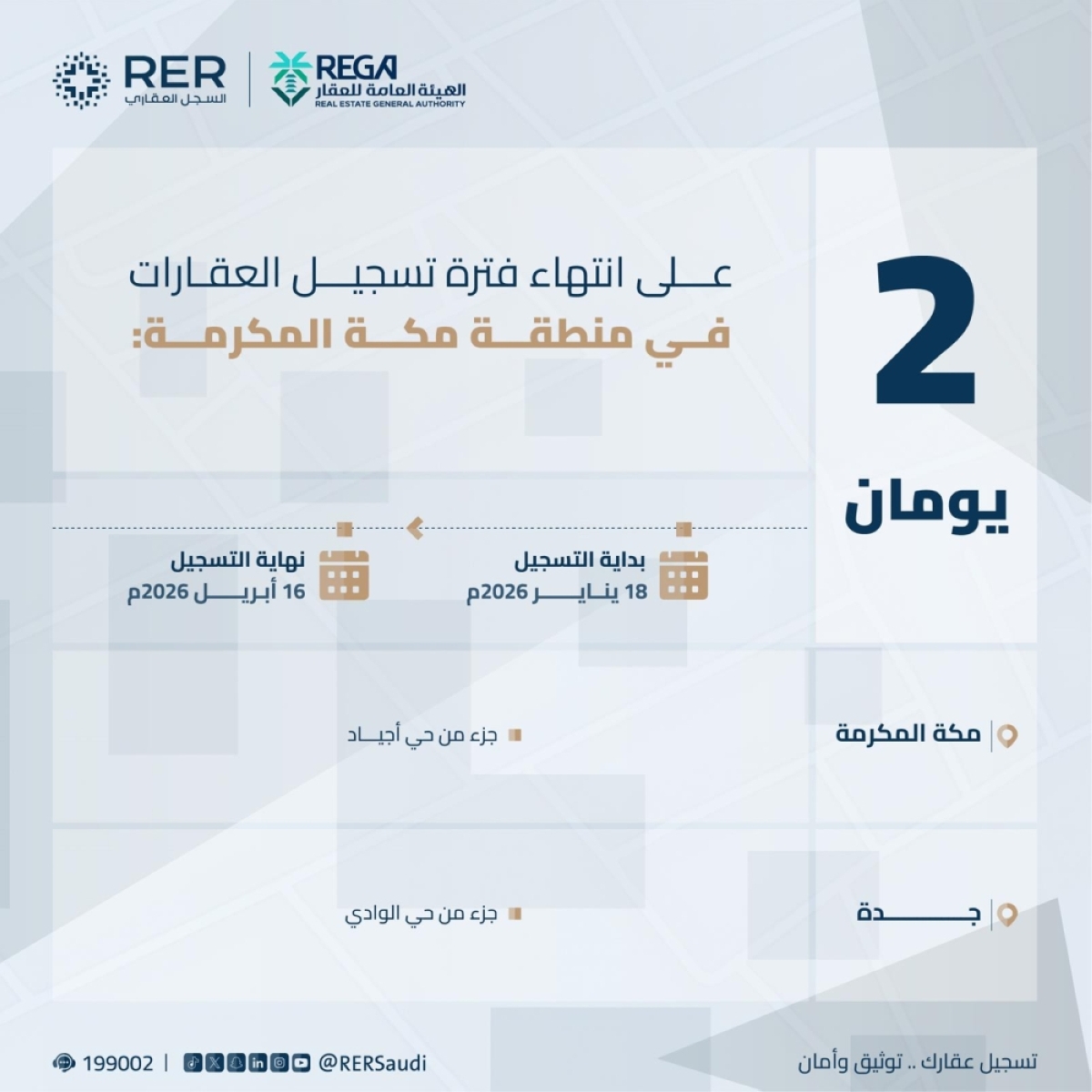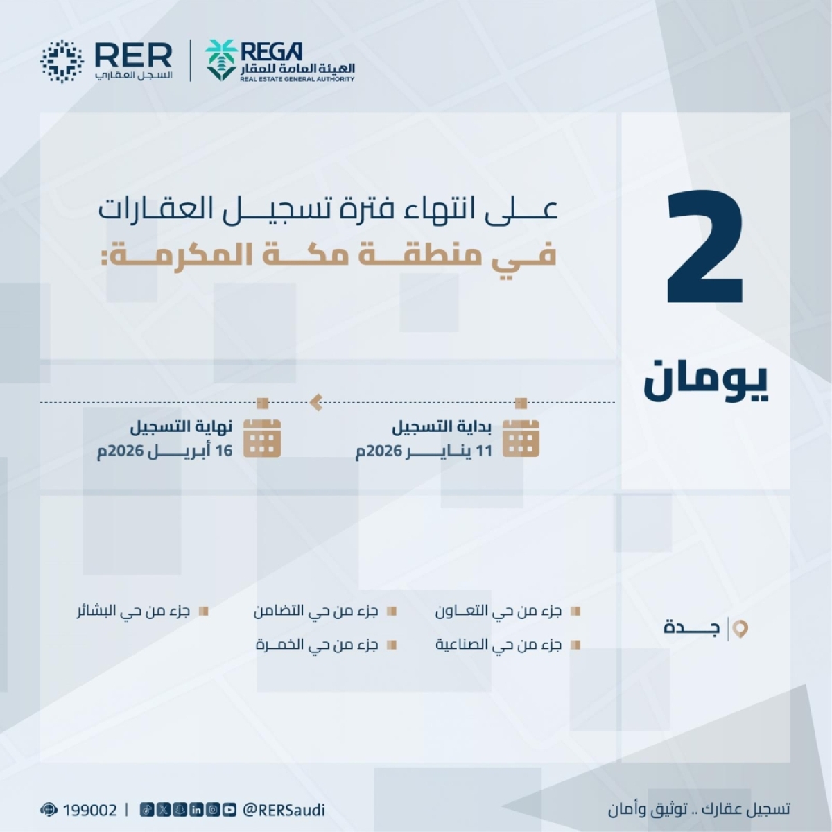 أعلنت الهيئة العامة للعقار عن قرب انتهاء المهلة المحددة للتسجيل العيني الأول للعقار لـ27 قطعة عقارية في 9 أحياء بمنطقتي مكة المكرمة والمدينة المنورة، وذلك بنهاية يوم الخميس 28 شوال 1447هـ، الموافق لـ 16 أبريل 2026م.