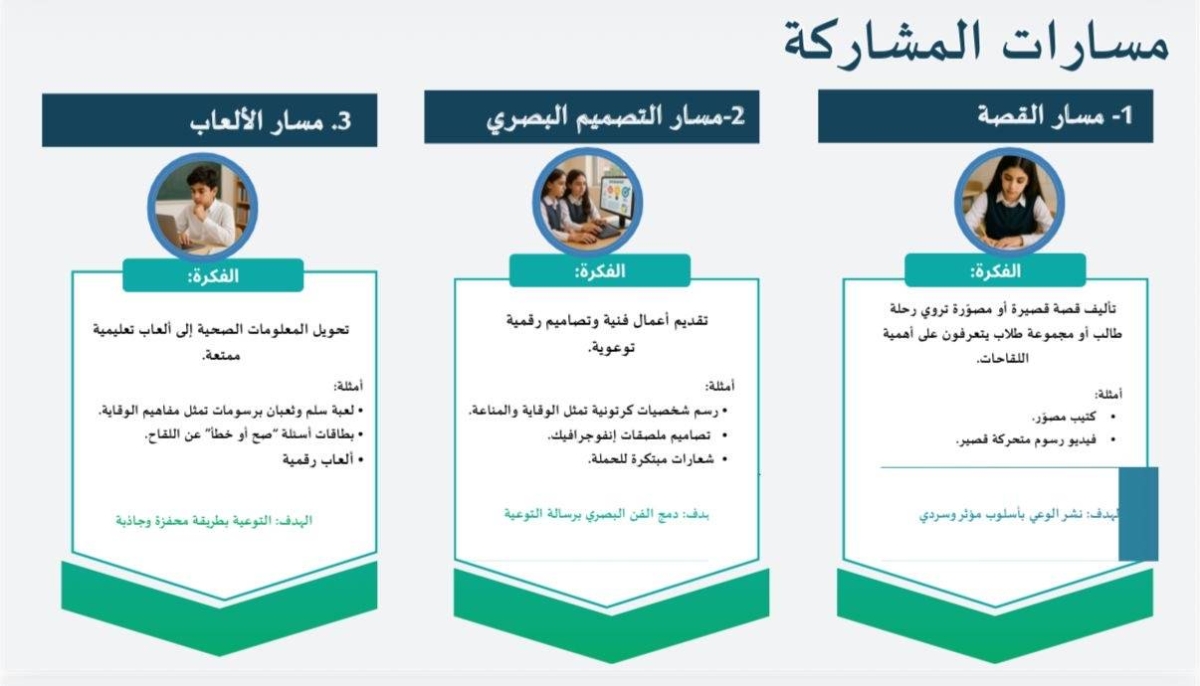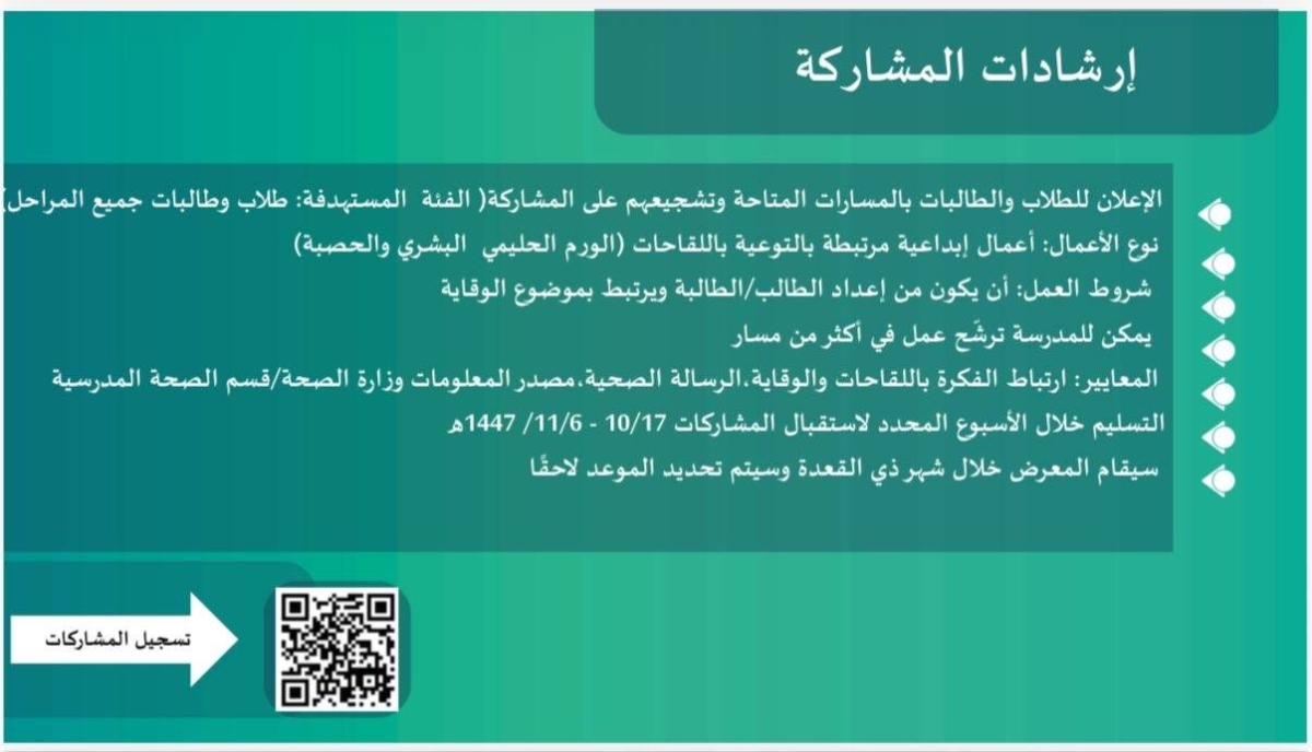 ودعت الجهات المختصة المدارس إلى المشاركة الفاعلة في المعرض وفق المتطلبات والضوابط المحددة بما يسهم في توحيد الجهود بين الجهات التعليمية والصحية وتعزيز مفاهيم الوقاية وأهمية التطعيم.