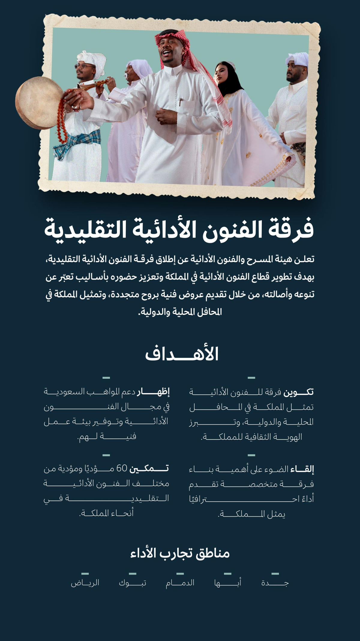 وأوضحت الهيئة أن المبادرة تأتي في إطار جهودها لتمكين المواهب السعودية في مجال الفنون الأدائية التقليدية، عبر توفير بيئة فنية متكاملة تتيح فرص التدريب والتطوير المستمر، بما يسهم في صقل المهارات ورفع جودة الإنتاج الفني، إلى جانب إتاحة فرص المشاركة في الفعاليات والمناسبات الثقافية التي تمثل المملكة محليا ودوليا. وبينت أن المشروع يستهدف تمكين أكثر من 55 مؤديا ومؤدية من مختلف مناطق المملكة، بما يعزز انتشار الفنون الأدائية التقليدية، ويضمن استدامتها وتطويرها.